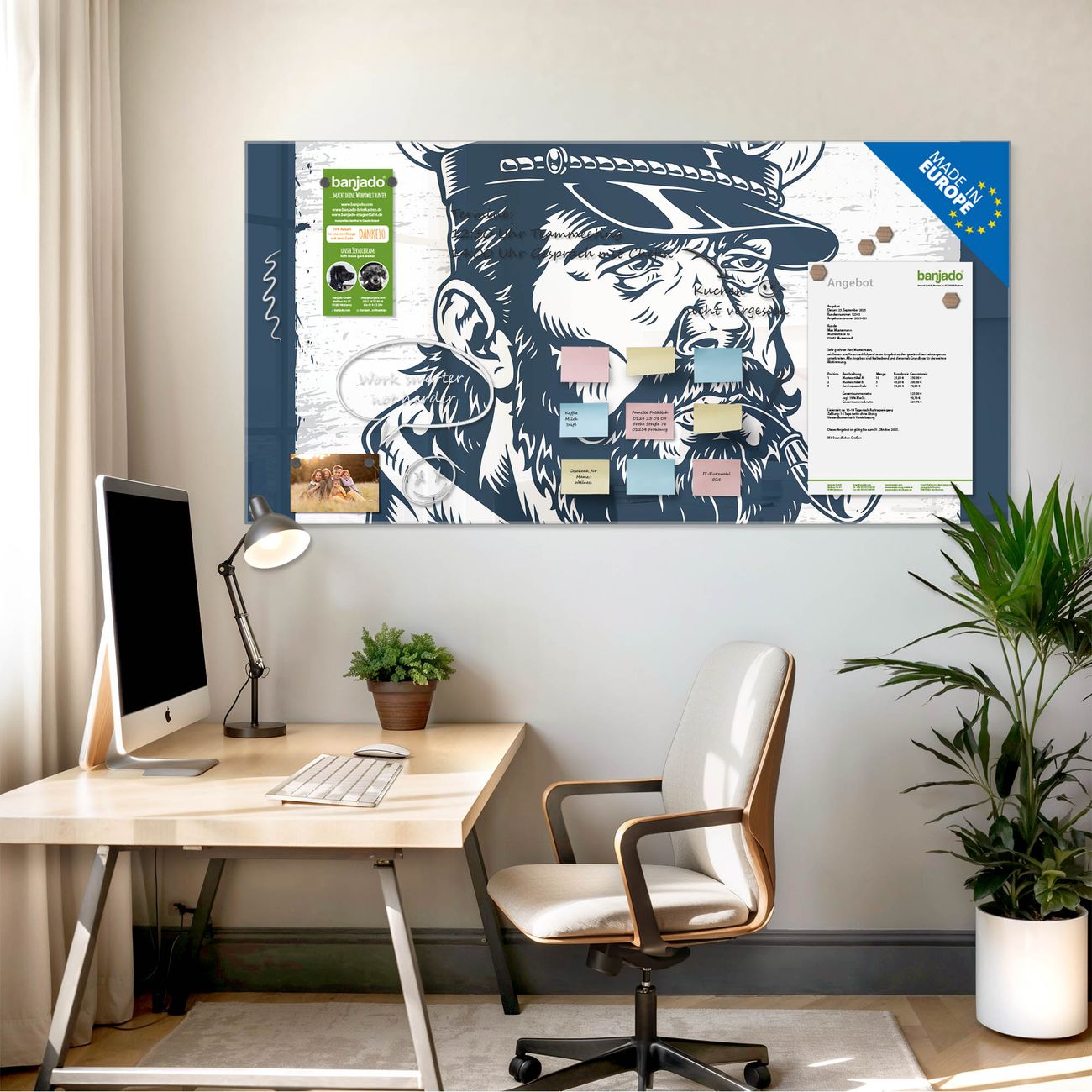 Die banjado Glas Magnettafel mit dem Motiv Motiv Kapitän Portrait verbindet Funktionalität mit Stil. Sie ersetzt das Zettelchaos durch klare Strukturen und bringt dabei eine warme, natürliche Atmosphäre in Ihr Zuhause. Ob im Büro, in der Küche oder im Eingangsbereich - dieses Design-Board zieht Blicke an und sorgt für Ordnung mit Charakter.