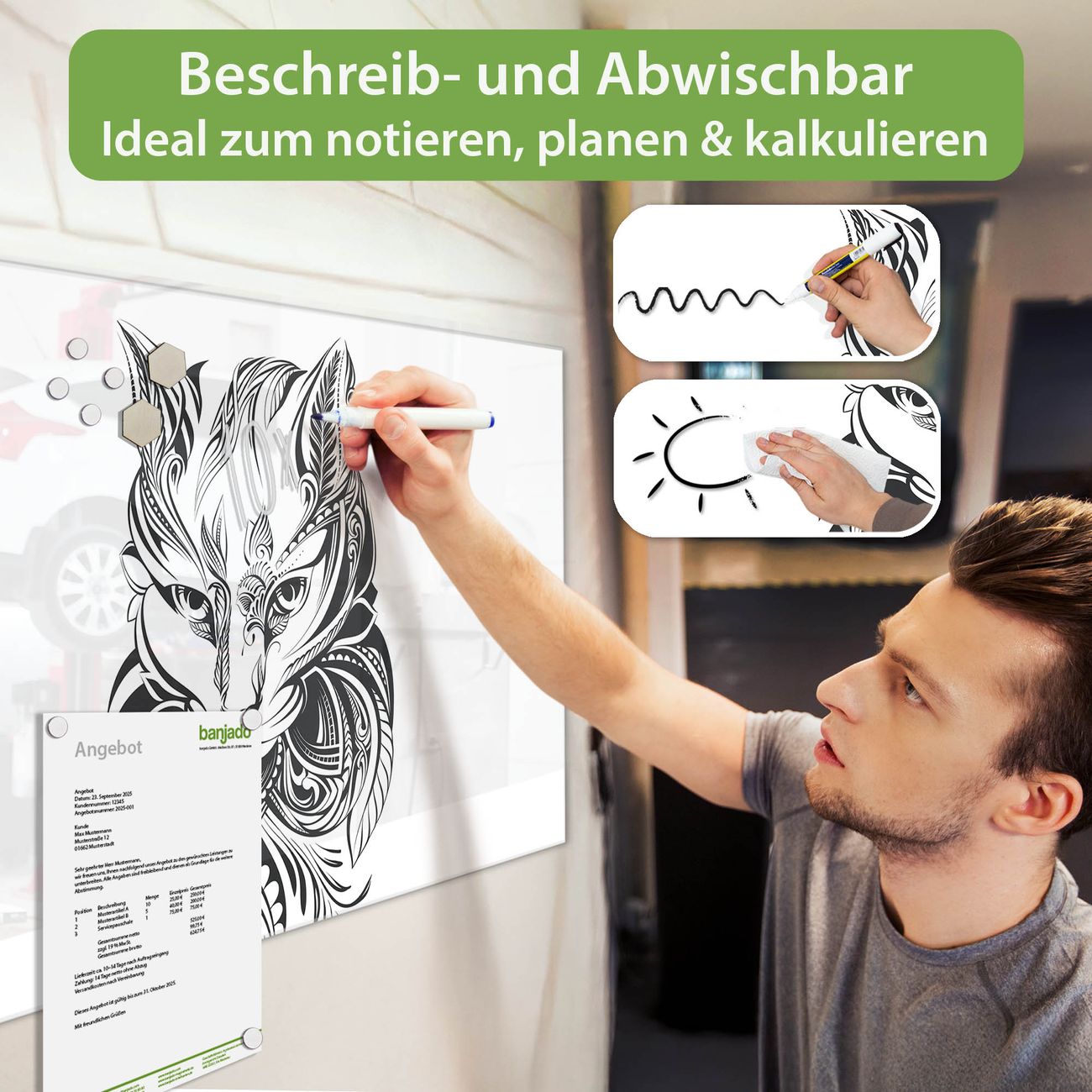 Bitte beachten Sie, dass ausschliessliche spezielle Magnete an der Glastafel haften. Wir empfehlen banjado Neodym Magnete, diese sind durch uns auf Wirksamkeit geprüft.