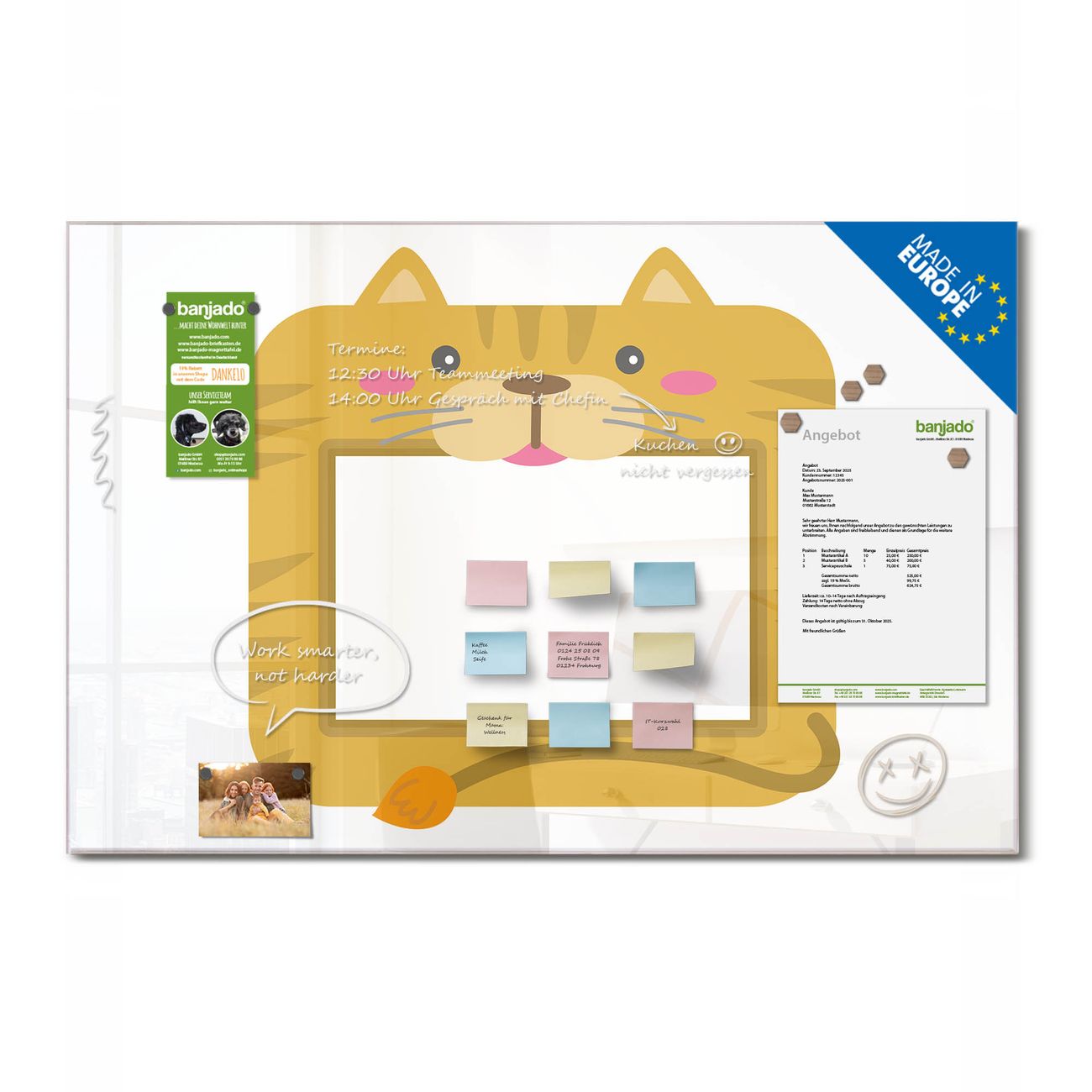 Jede Glas Magnettafel wird in unserer Werkstatt von Hand gefertigt und sorgfältig geprüft. So erhalten Sie ein echtes Qualitätsprodukt, das Funktion und Ästhetik perfekt vereint.?? Warum banjado?