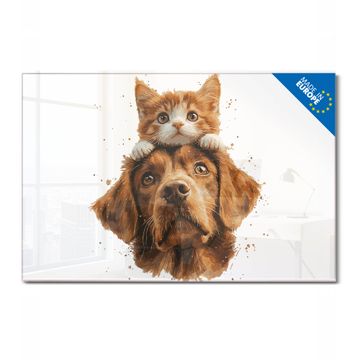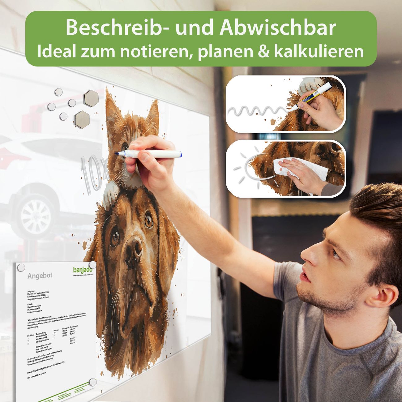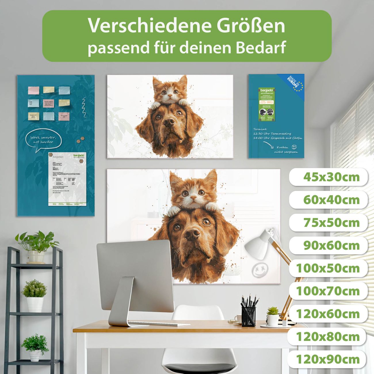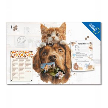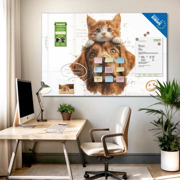 Material: 4mm Sicherheitsglas mit Metallrückwand Eigenschaften: beschreibbar, magnetisch, kratzfest Maße: 75x50x0,6cm, 5,63kg schwer Motiv Nummer 13406 Katzen- und Hundefreunde Zubehör: inklusive 4 Neodym-Magnete