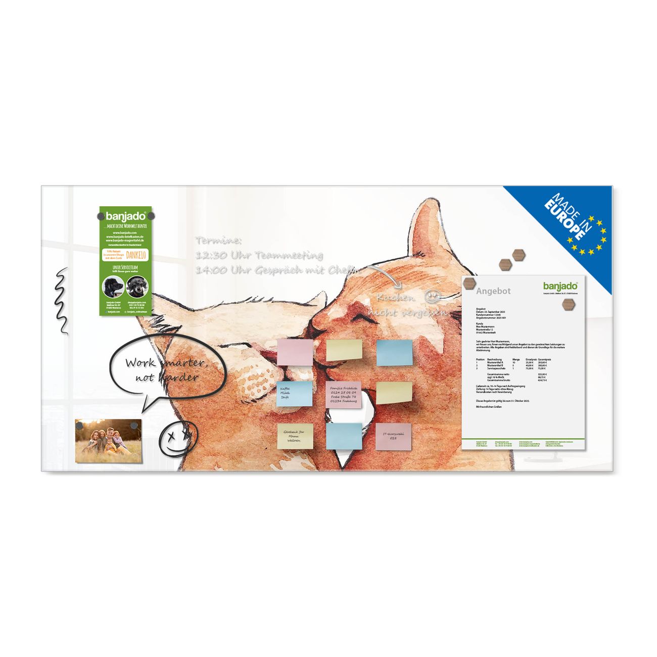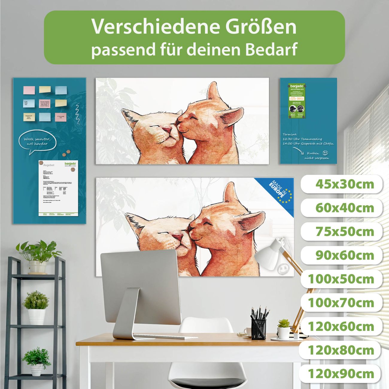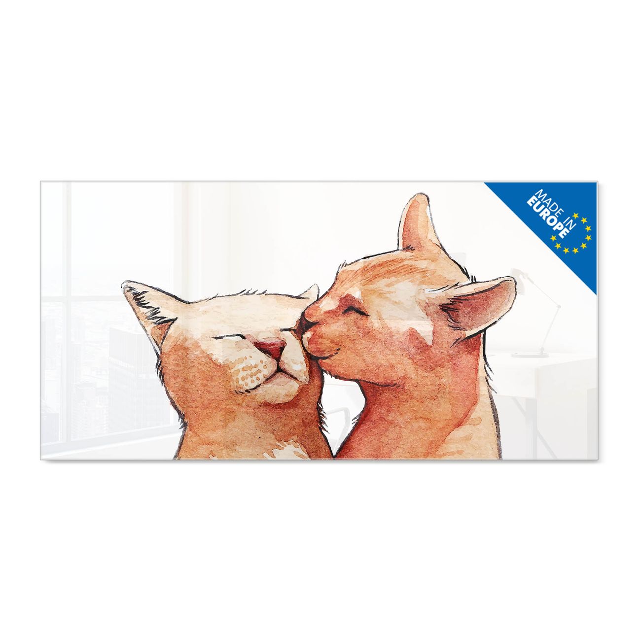 Material: 4mm Sicherheitsglas mit Metallrückwand Eigenschaften: beschreibbar, magnetisch, kratzfest Maße: 100x50x0,6cm, 7,50kg schwer Motiv Nummer 13435 Katzenkuss Zubehör: inklusive 4 Neodym-Magnete