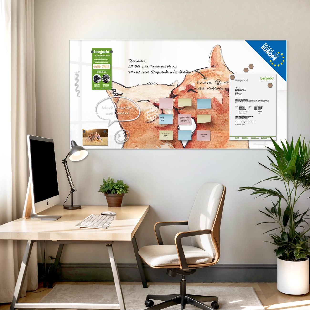 Die banjado Glas Magnettafel mit dem Motiv Motiv Katzenkuss verbindet Funktionalität mit Stil. Sie ersetzt das Zettelchaos durch klare Strukturen und bringt dabei eine warme, natürliche Atmosphäre in Ihr Zuhause. Ob im Büro, in der Küche oder im Eingangsbereich - dieses Design-Board zieht Blicke an und sorgt für Ordnung mit Charakter.