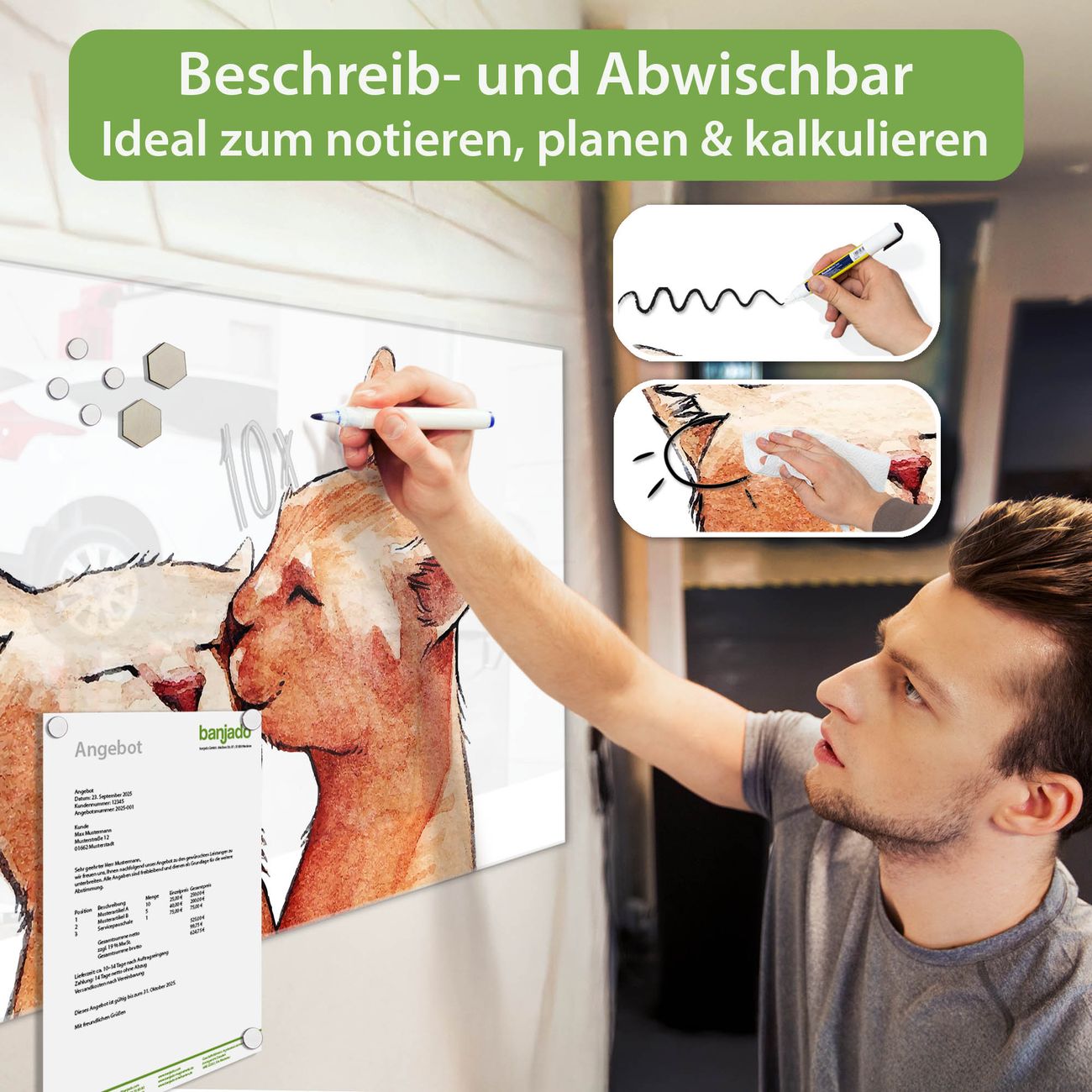 Bitte beachten Sie, dass ausschliessliche spezielle Magnete an der Glastafel haften. Wir empfehlen banjado Neodym Magnete, diese sind durch uns auf Wirksamkeit geprüft.