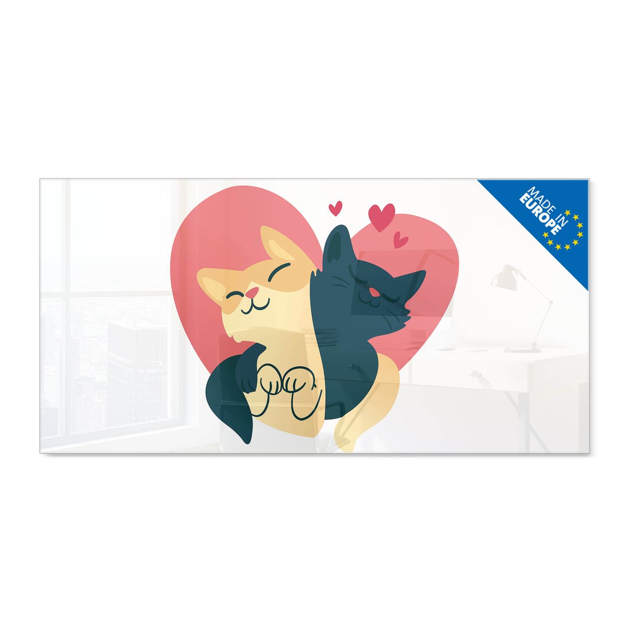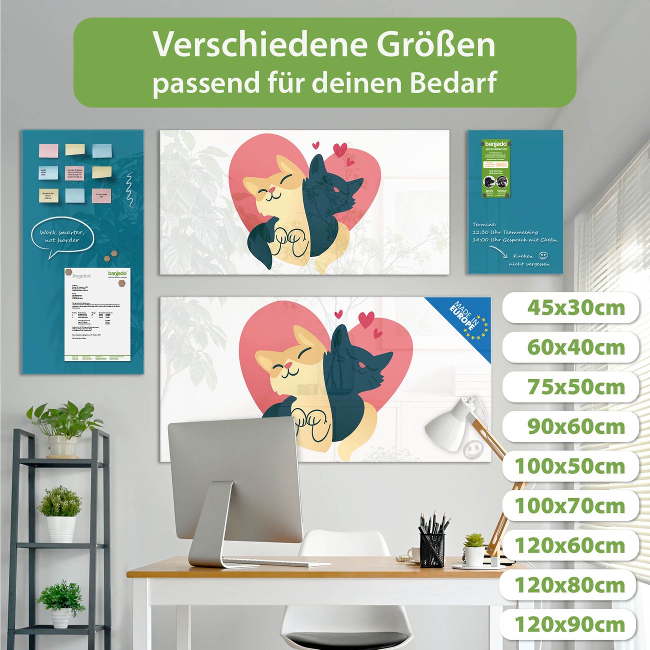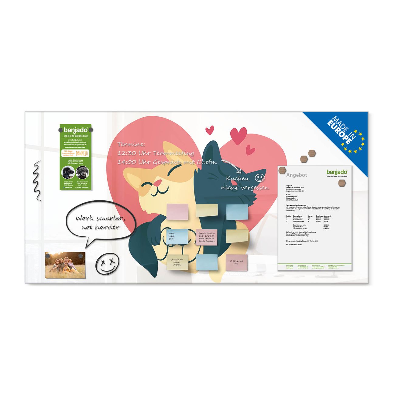 Material: 4mm Sicherheitsglas mit Metallrückwand Eigenschaften: beschreibbar, magnetisch, kratzfest Maße: 100x50x0,6cm, 7,50kg schwer Motiv Nummer 13436 Katzenliebe Zubehör: inklusive 4 Neodym-Magnete