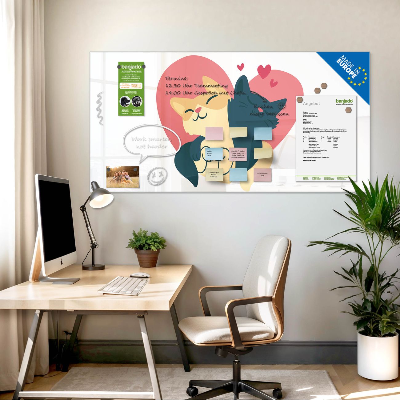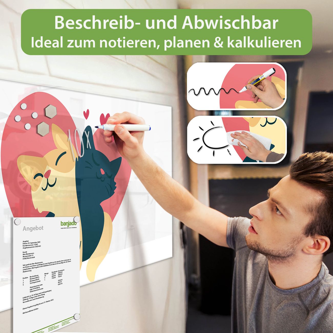 Die banjado Glas Magnettafel mit dem Motiv Motiv Katzenliebe verbindet Funktionalität mit Stil. Sie ersetzt das Zettelchaos durch klare Strukturen und bringt dabei eine warme, natürliche Atmosphäre in Ihr Zuhause. Ob im Büro, in der Küche oder im Eingangsbereich - dieses Design-Board zieht Blicke an und sorgt für Ordnung mit Charakter.
