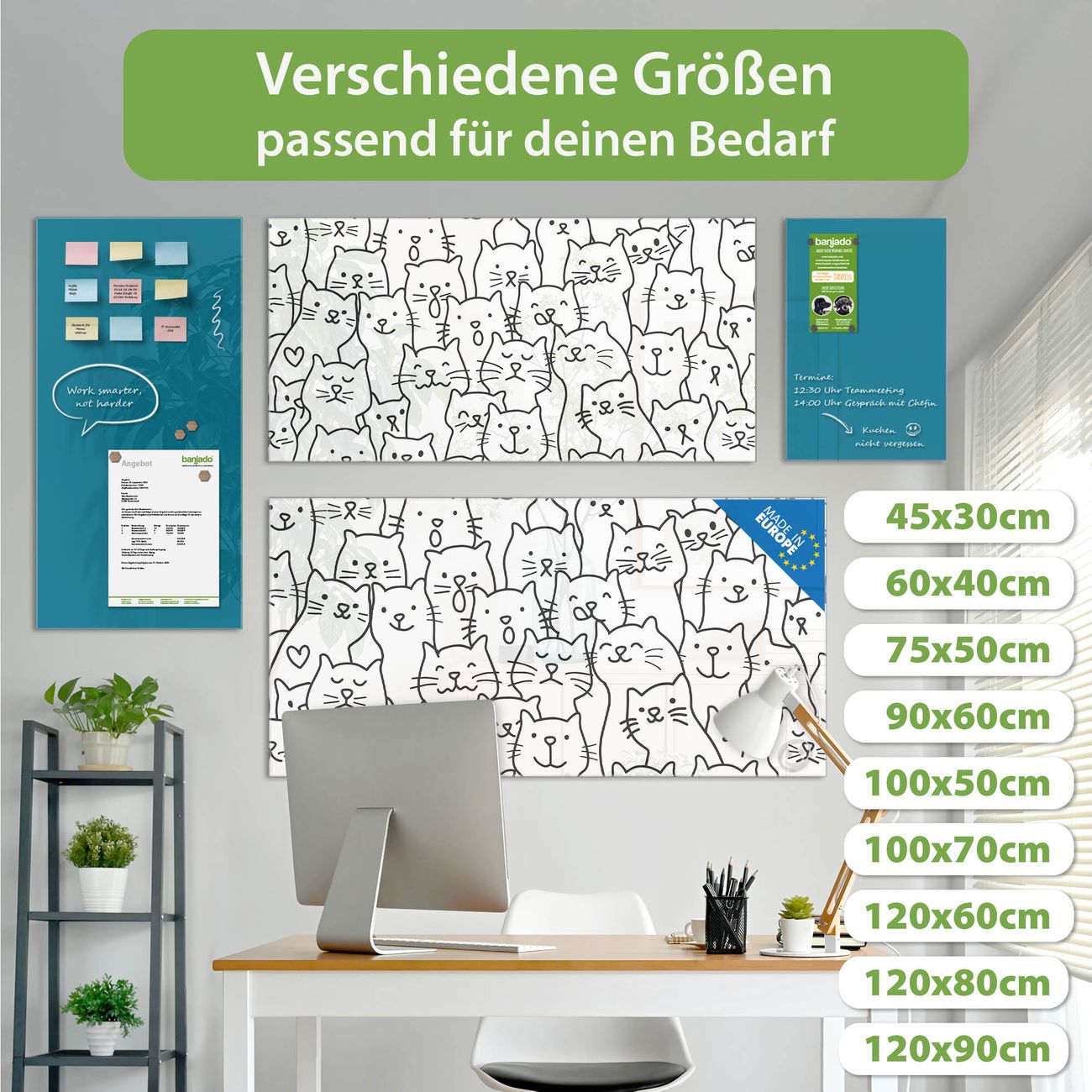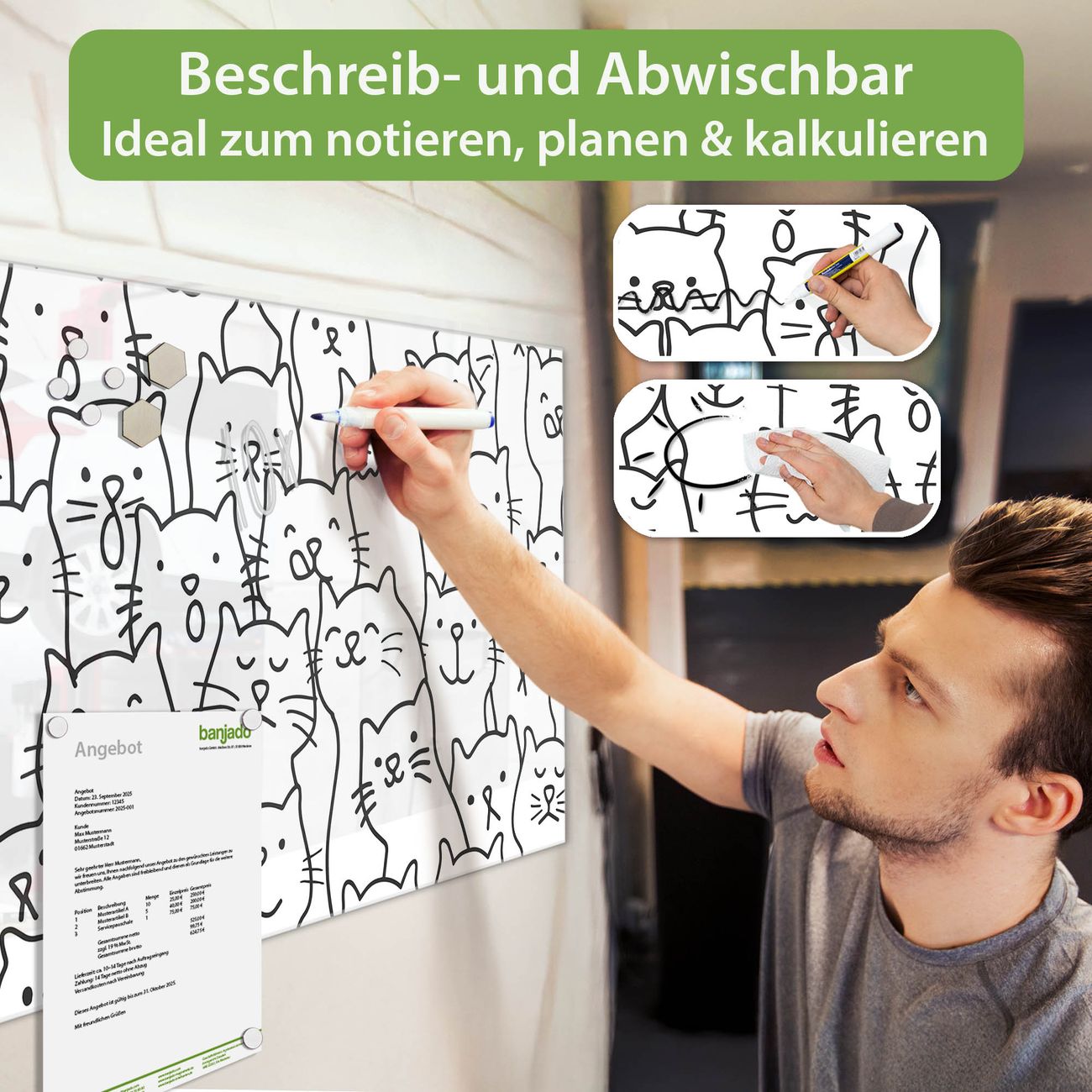 Material: 4mm Sicherheitsglas mit Metallrückwand Eigenschaften: beschreibbar, magnetisch, kratzfest Maße: 100x50x0,6cm, 7,50kg schwer Motiv Nummer 13433 Katzenparade Zubehör: inklusive 4 Neodym-Magnete