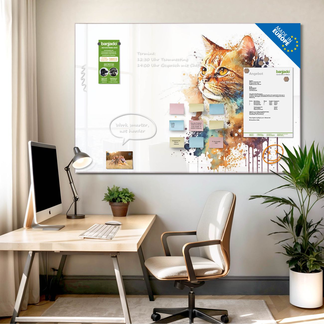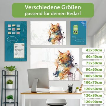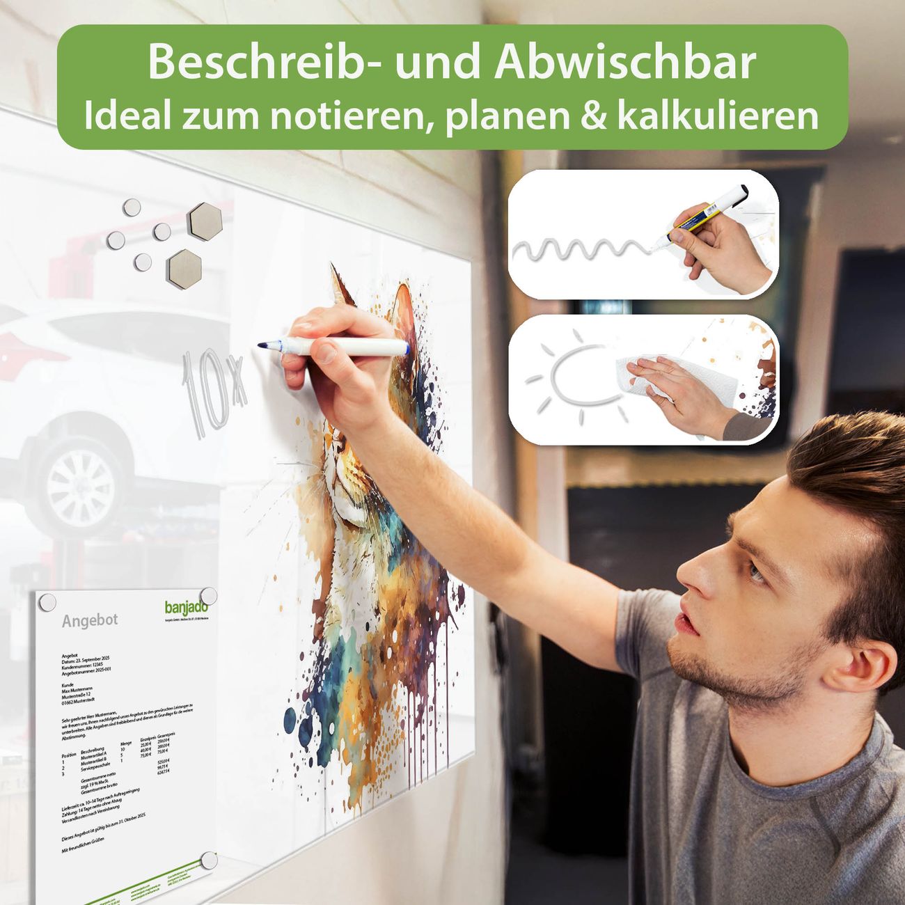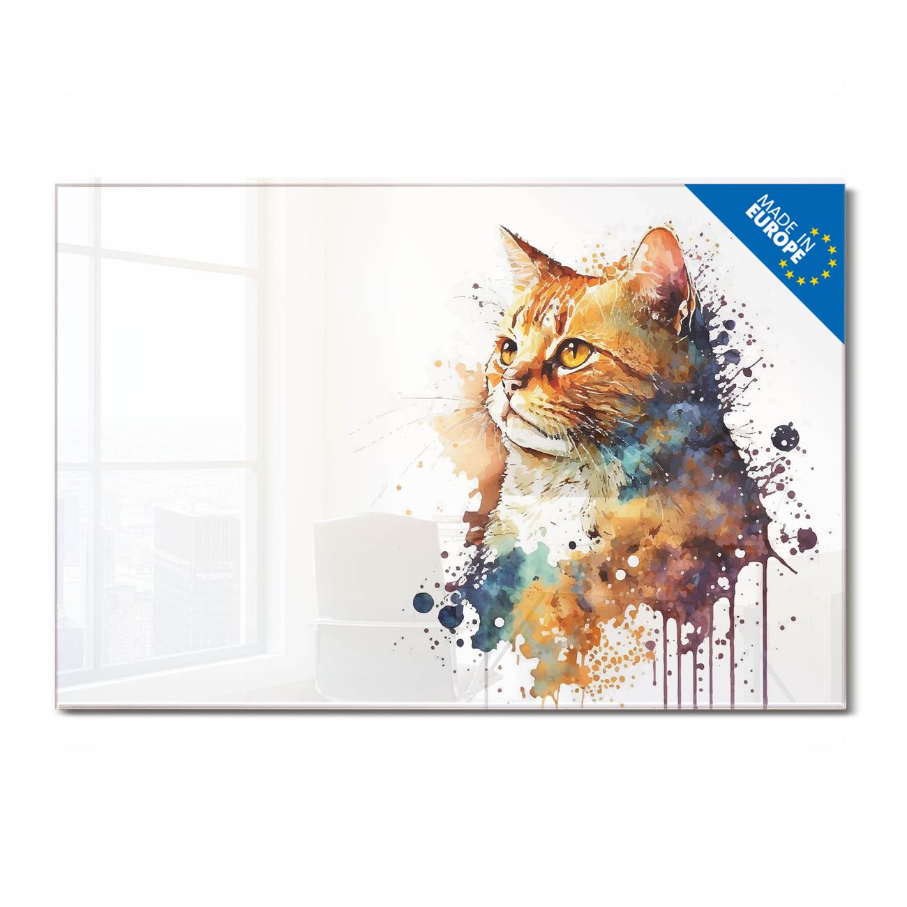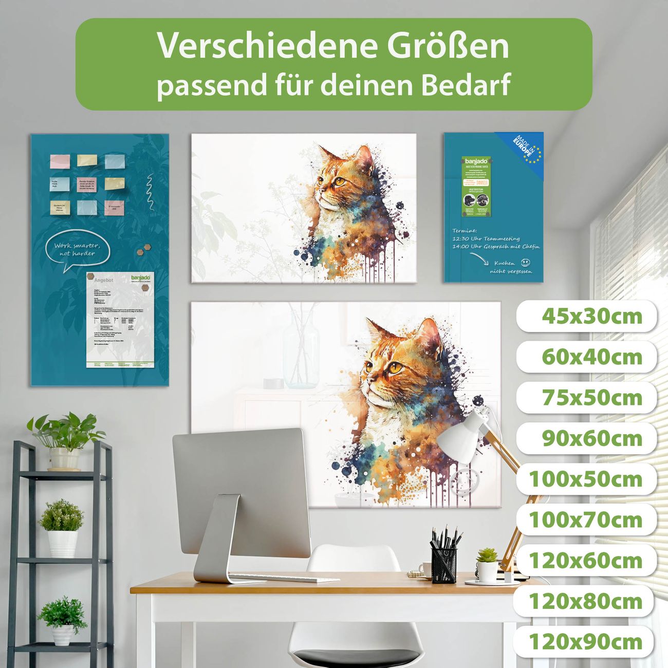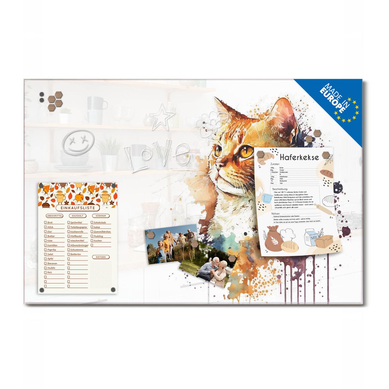 Material: 4mm Sicherheitsglas mit Metallrückwand Eigenschaften: beschreibbar, magnetisch, kratzfest Maße: 75x50x0,6cm, 5,63kg schwer Motiv Nummer 13446 Katzenportrait in Aquarell Zubehör: inklusive 4 Neodym-Magnete