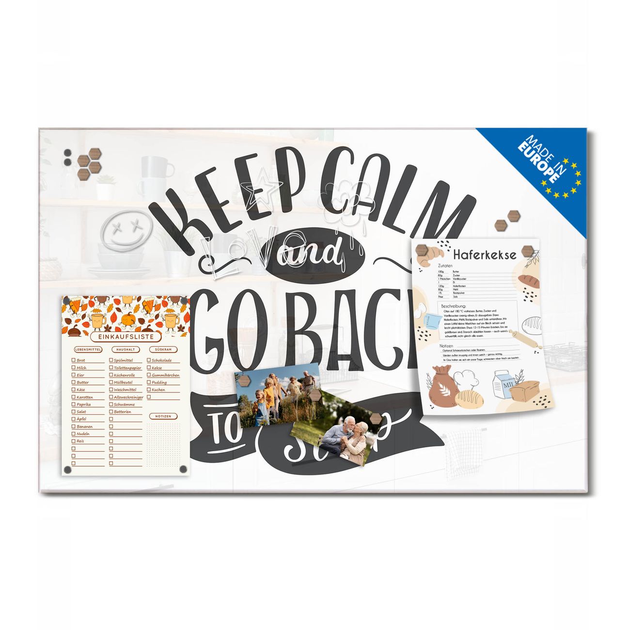 Ein Stück Design, das Ihren Alltag organisiert. Schreiben, heften, inspirieren - alles an einem Ort. Qualität, die man spürt. Montage leicht gemacht. Handwerk mit Herz - veredelt in Sachsen. Einzigartiges Design mit Motiv Motiv Keep Calm Schriftzug Beschreibbare Glasoberfläche, leicht zu reinigen Starke Magnetkraft durch Stahlrückwand Inklusive 4 Neodym-Magneten Flexible Montageoptionen Handveredelt in Sachsen - Qualität, die bleibt