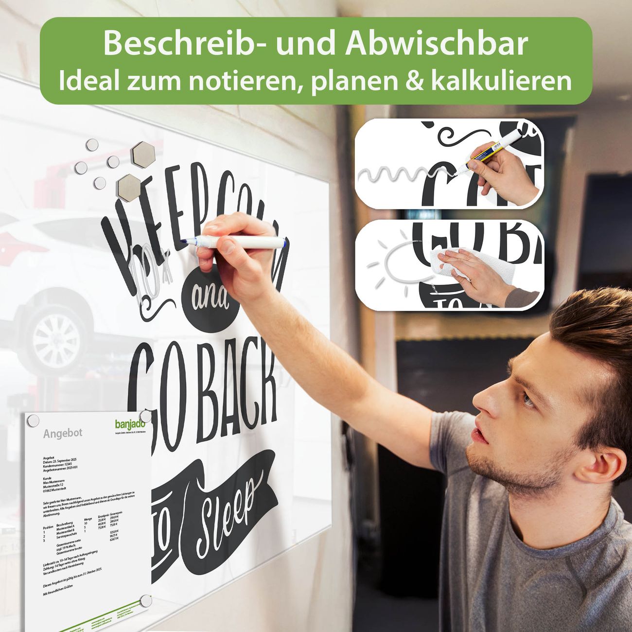 Jede Glas Magnettafel wird in unserer Werkstatt von Hand gefertigt und sorgfältig geprüft. So erhalten Sie ein echtes Qualitätsprodukt, das Funktion und Ästhetik perfekt vereint.?? Warum banjado?