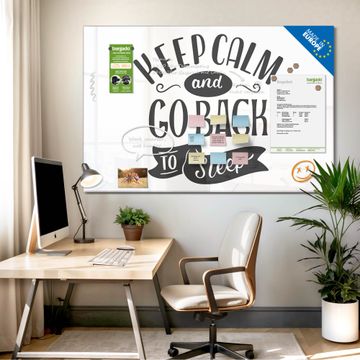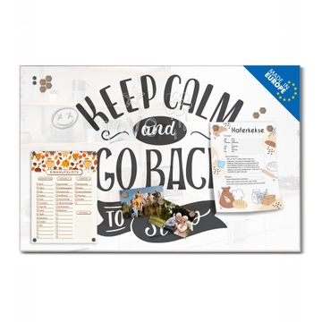 Material: 4mm Sicherheitsglas mit Metallrückwand Eigenschaften: beschreibbar, magnetisch, kratzfest Maße: 90x60x0,6cm, 8,10kg schwer Motiv Nummer 13369 Keep Calm Schriftzug Zubehör: inklusive 4 Neodym-Magnete