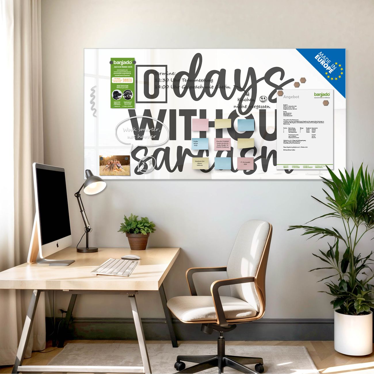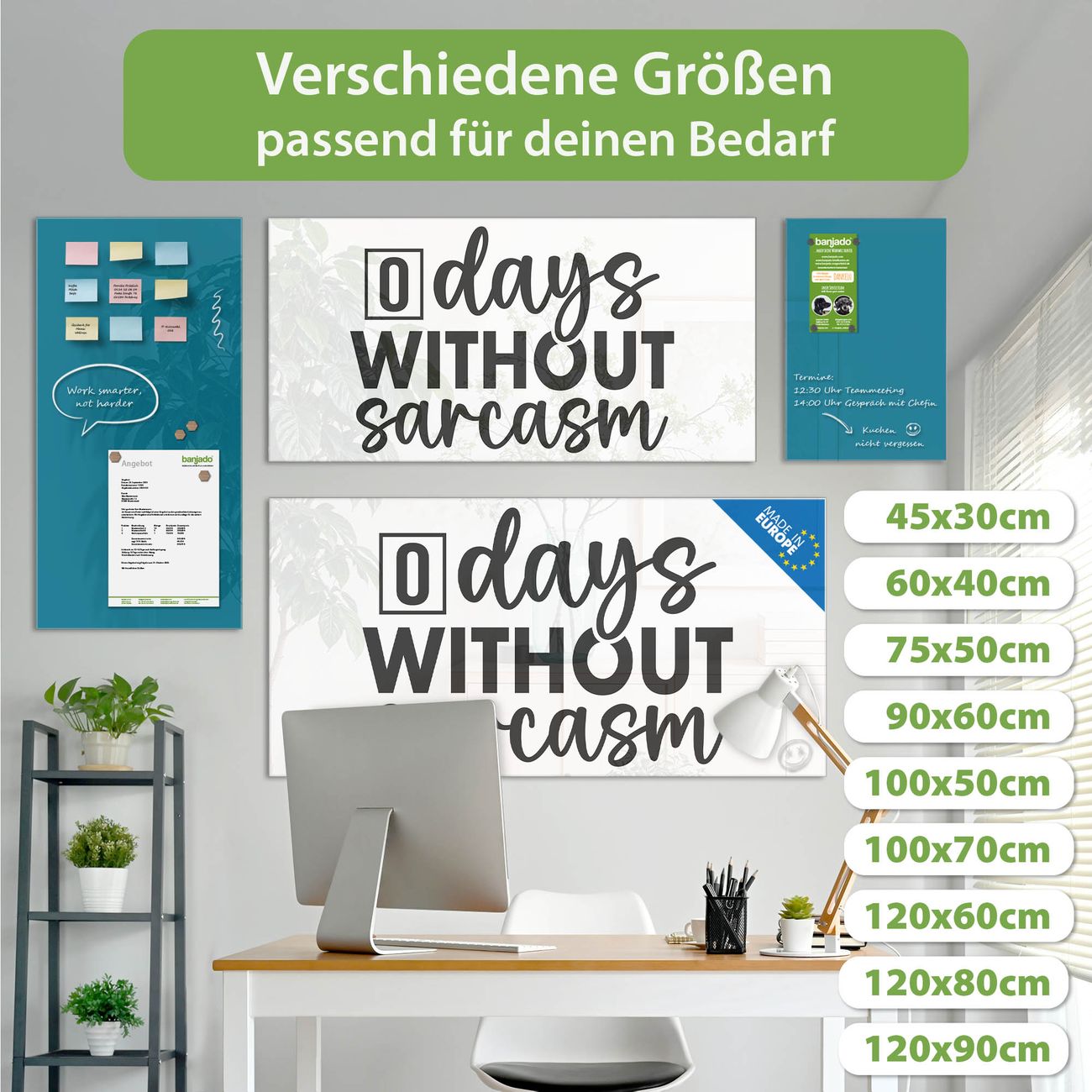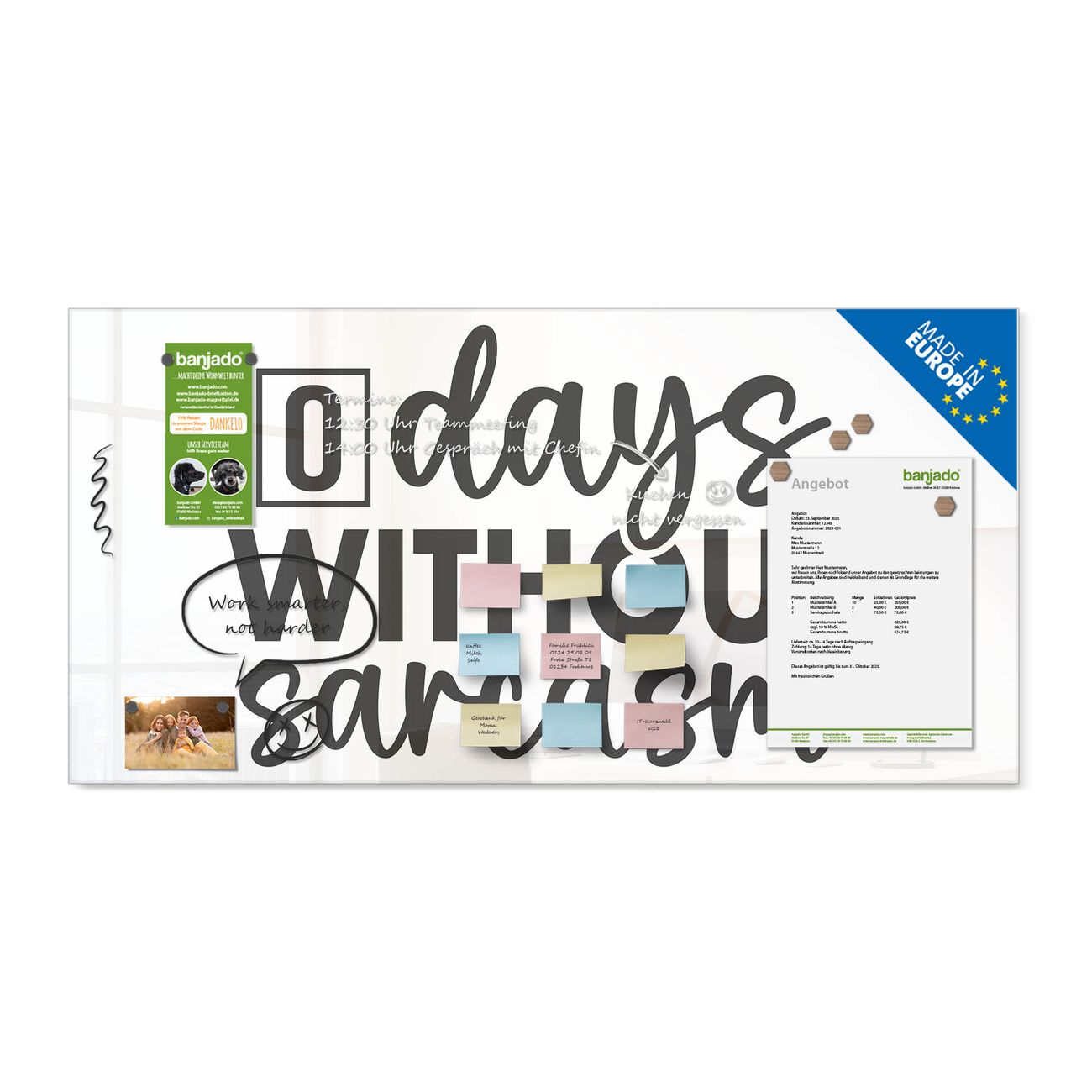 Material: 4mm Sicherheitsglas mit Metallrückwand Eigenschaften: beschreibbar, magnetisch, kratzfest Maße: 100x50x0,6cm, 7,50kg schwer Motiv Nummer 13357 Kein Tag ohne Sarkasmus Zubehör: inklusive 4 Neodym-Magnete