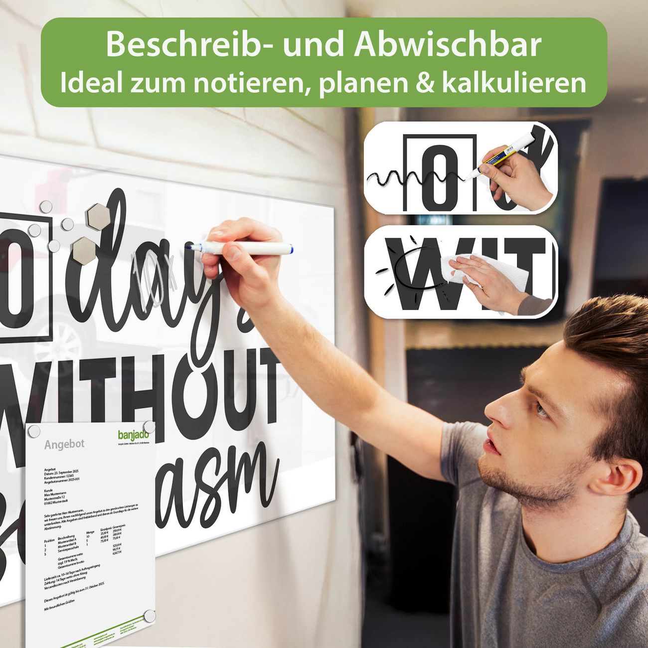 Auf der glatten Glasoberfläche lassen sich Termine, Rezepte oder Notizen ganz einfach mit Kreidestiften festhalten und rückstandslos entfernen. Starke Neodym-Magnete halten Ihre wichtigsten Erinnerungen sicher an Ort und Stelle. So entsteht Ihre ganz persönliche Ideenwand - jeden Tag neu.
