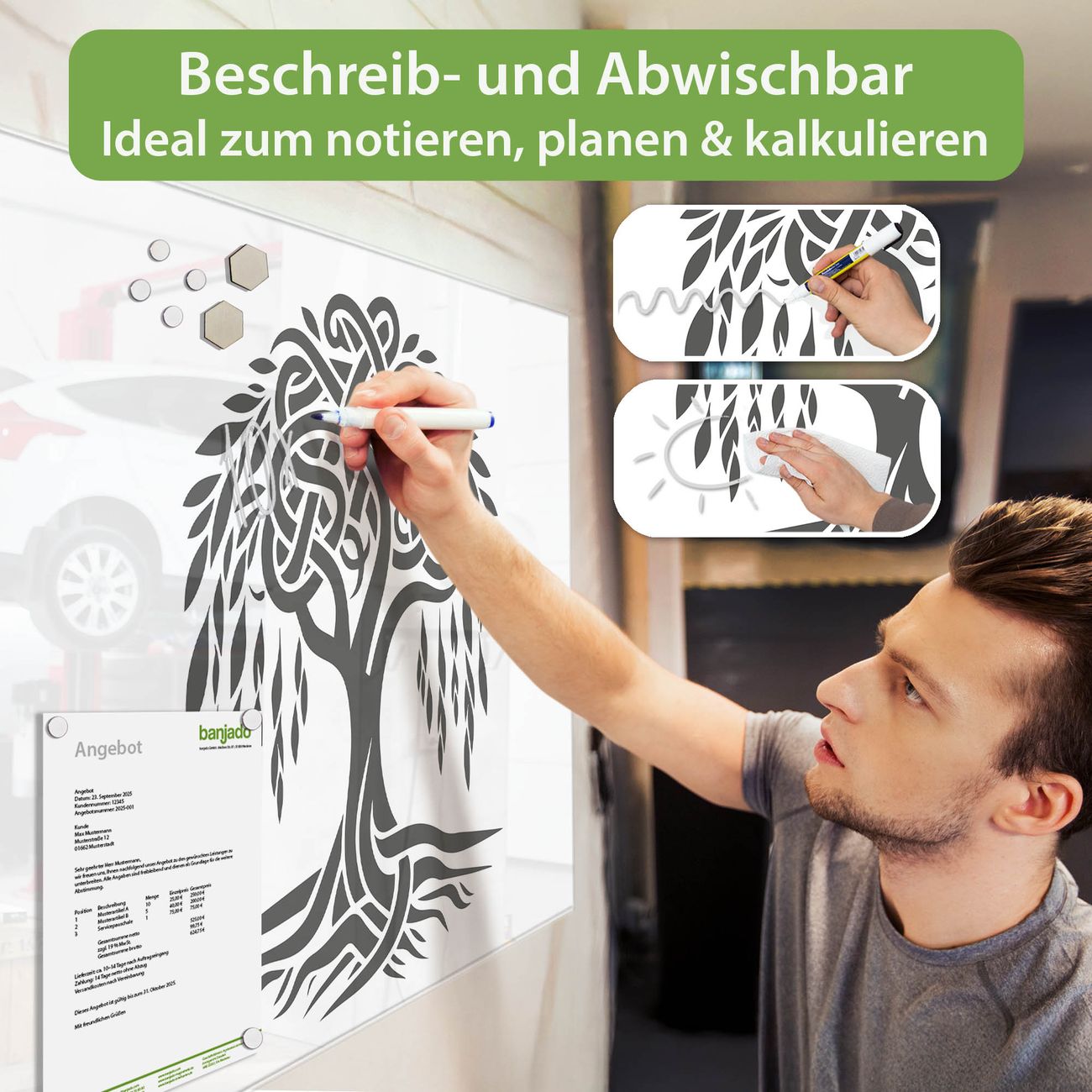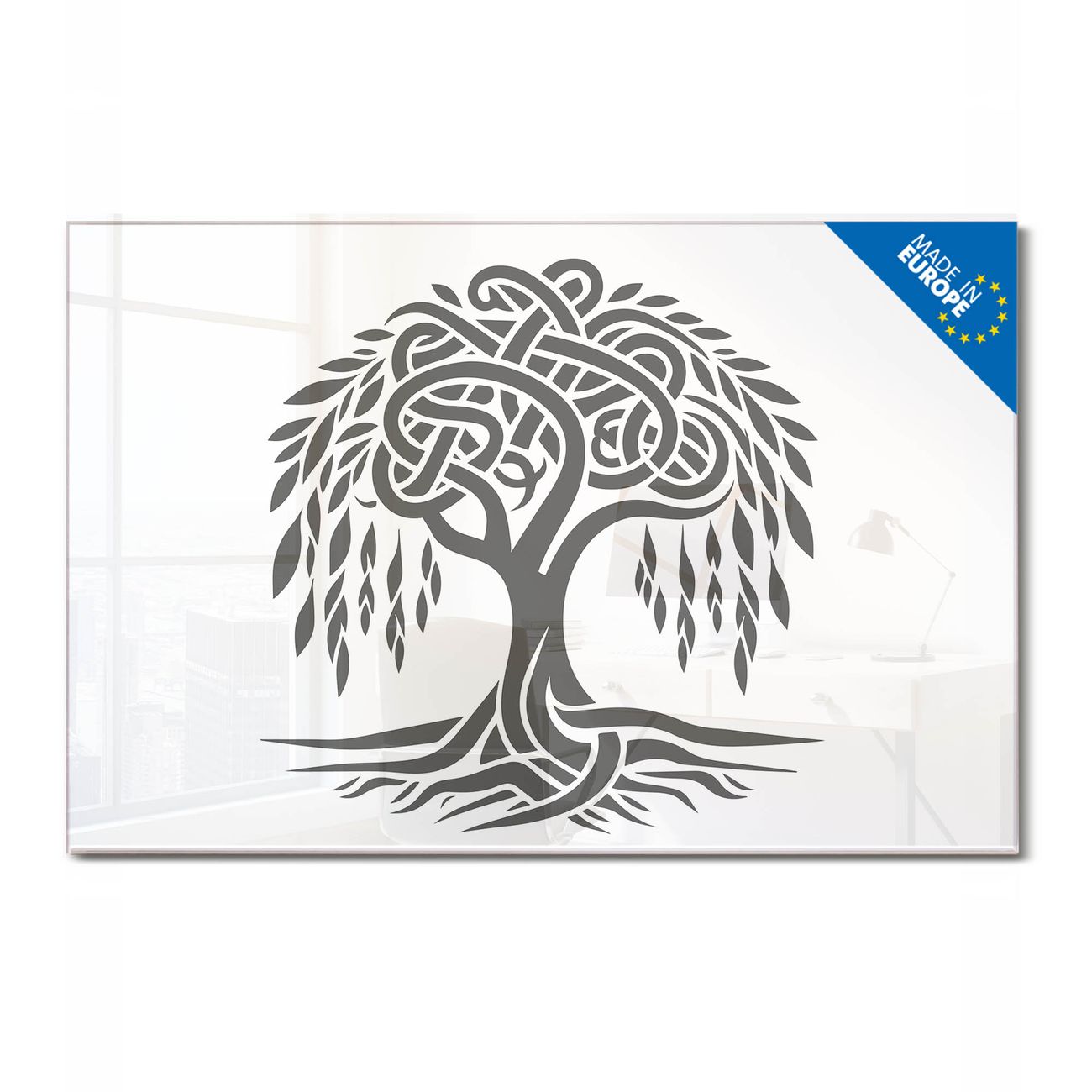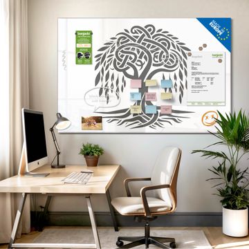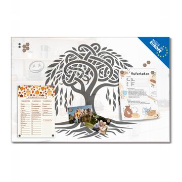 Material: 4mm Sicherheitsglas mit Metallrückwand Eigenschaften: beschreibbar, magnetisch, kratzfest Maße: 75x50x0,6cm, 5,63kg schwer Motiv Nummer 13337 Keltischer Baum des Lebens Zubehör: inklusive 4 Neodym-Magnete