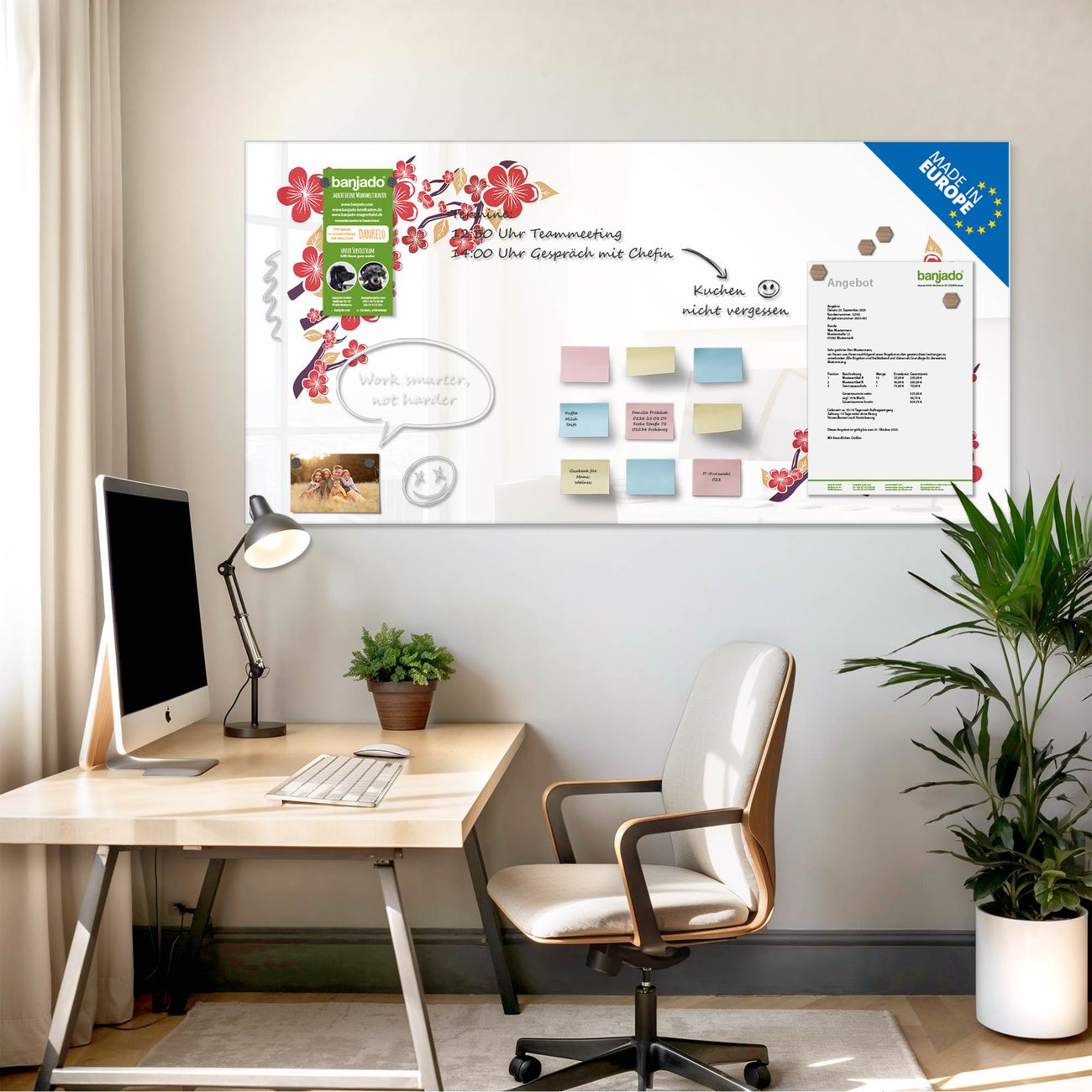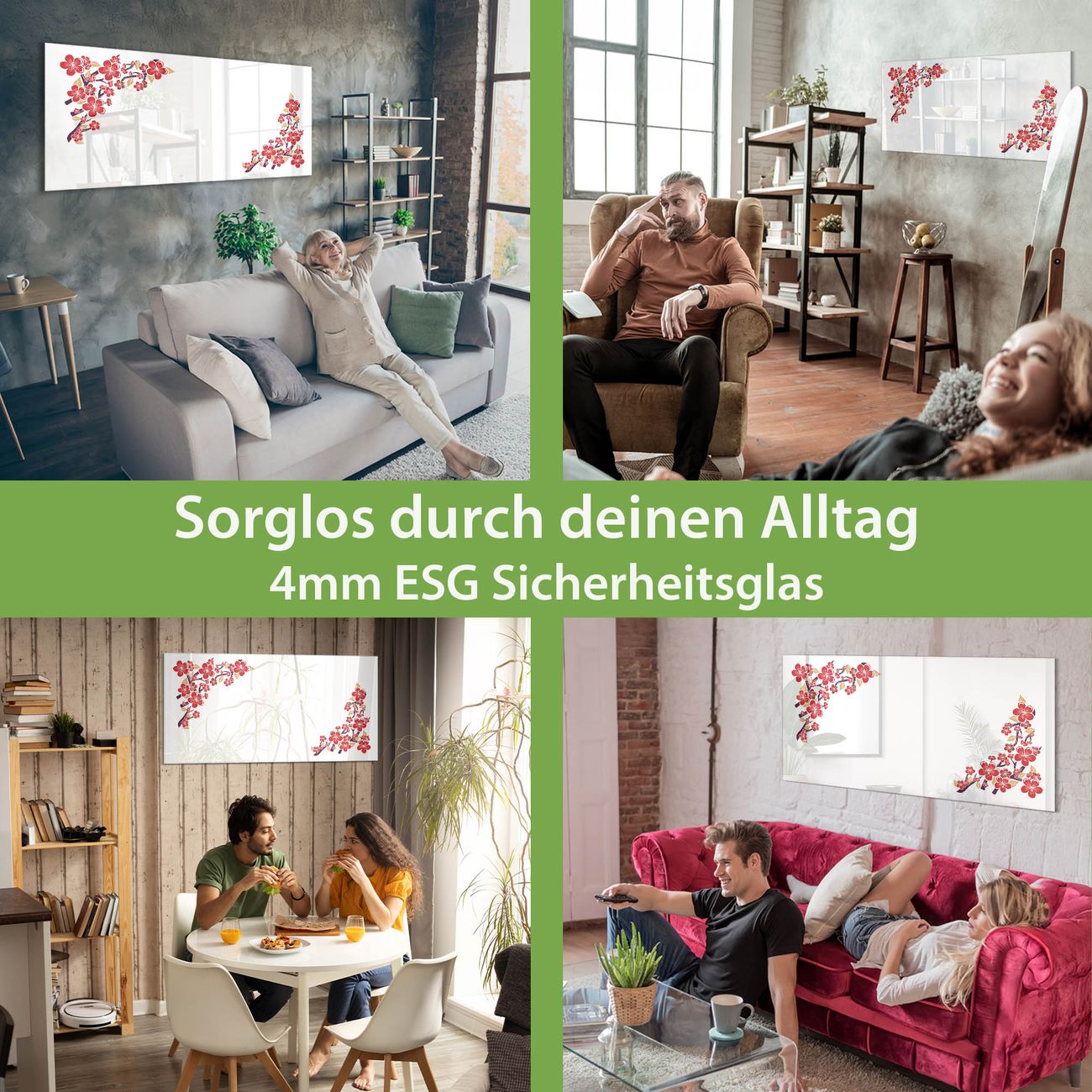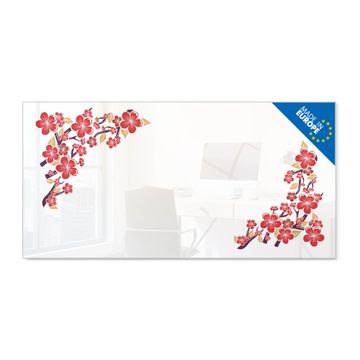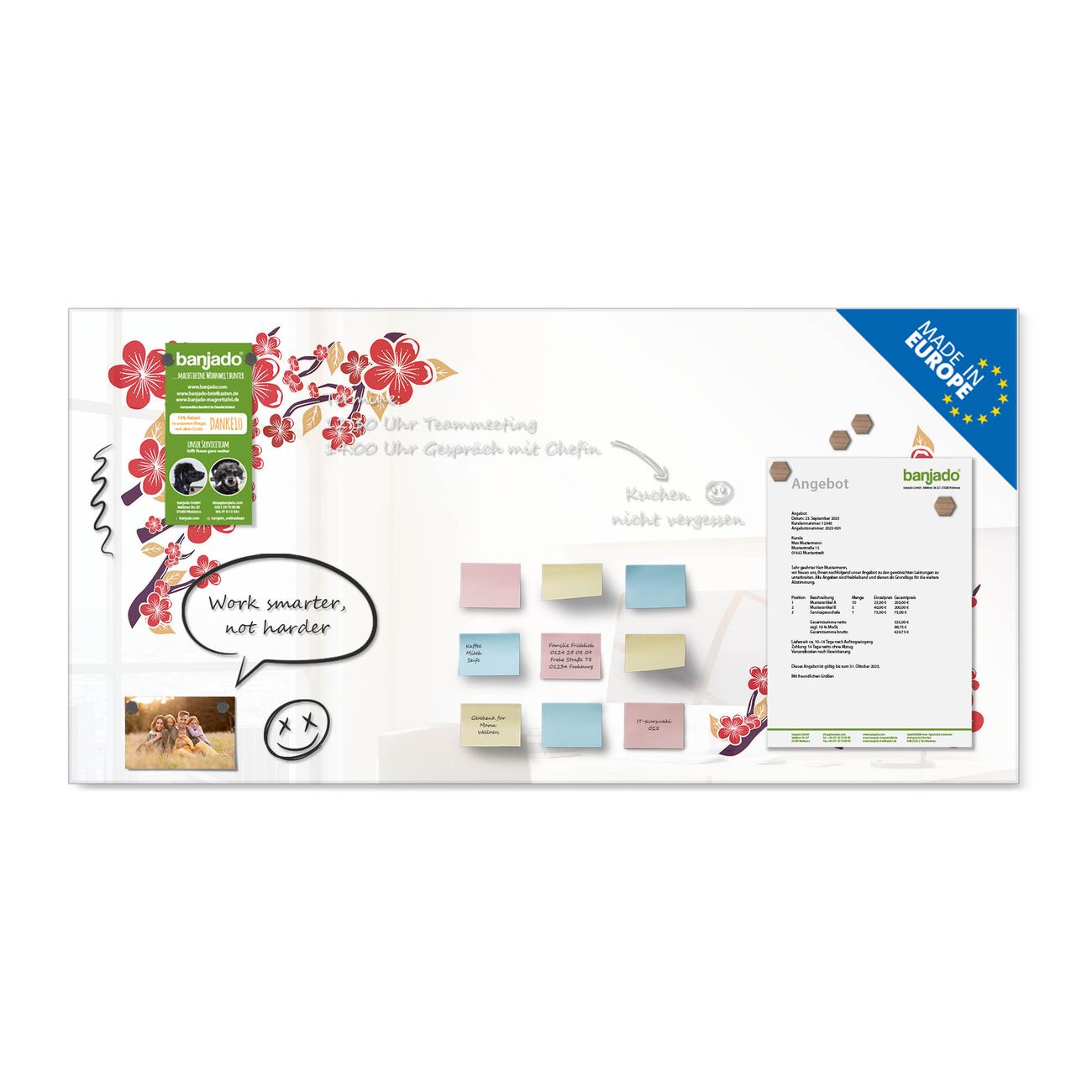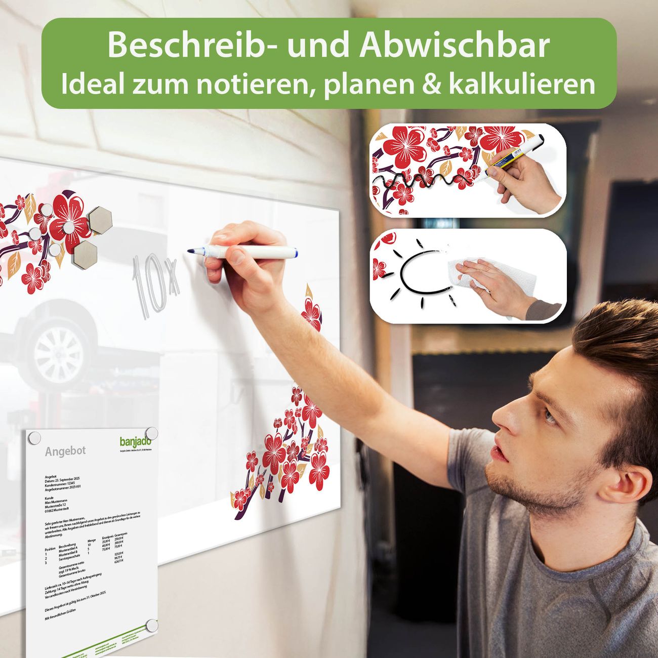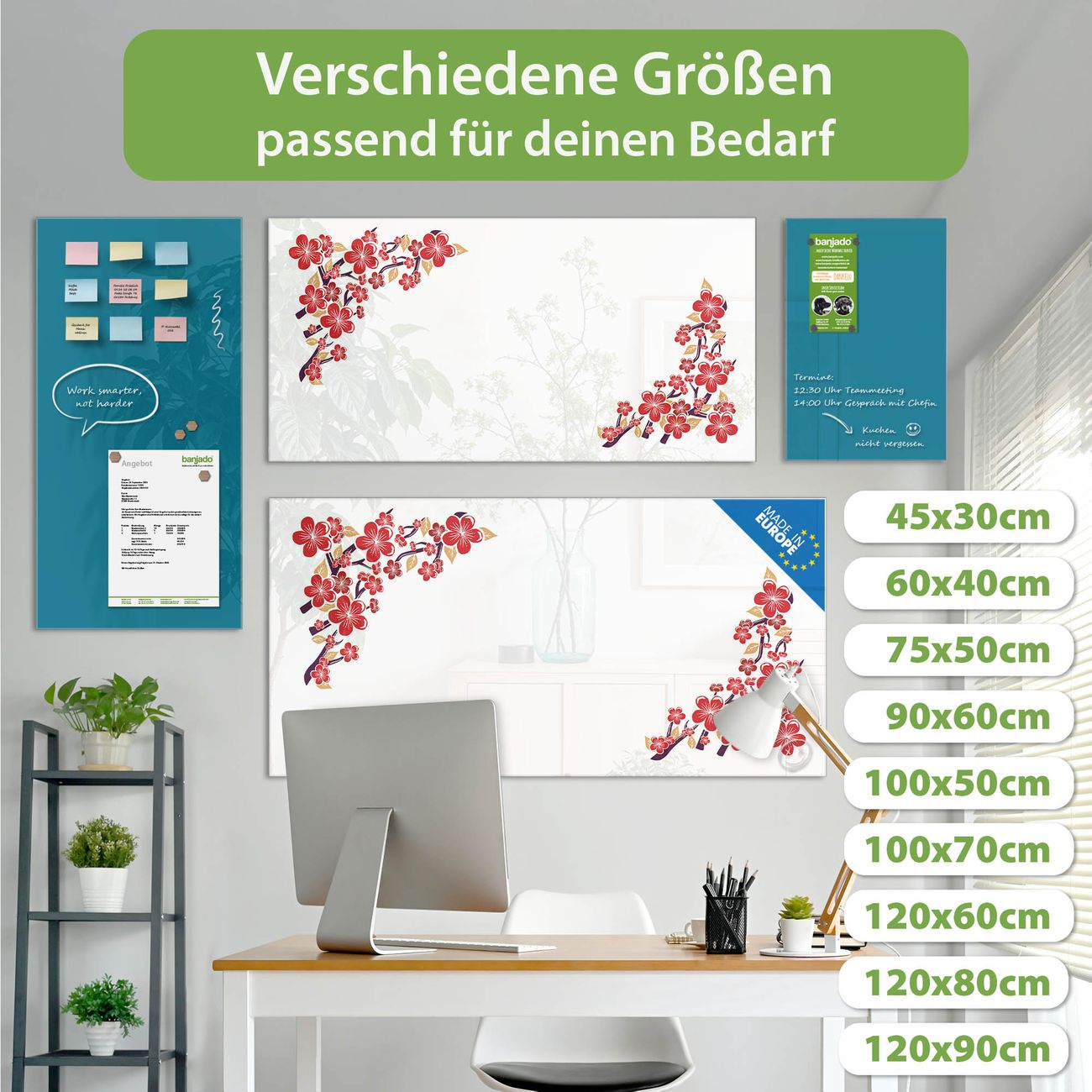 Material: 4mm Sicherheitsglas mit Metallrückwand Eigenschaften: beschreibbar, magnetisch, kratzfest Maße: 100x50x0,6cm, 7,50kg schwer Motiv Nummer 13210 Kirschblütenmuster Zubehör: inklusive 4 Neodym-Magnete