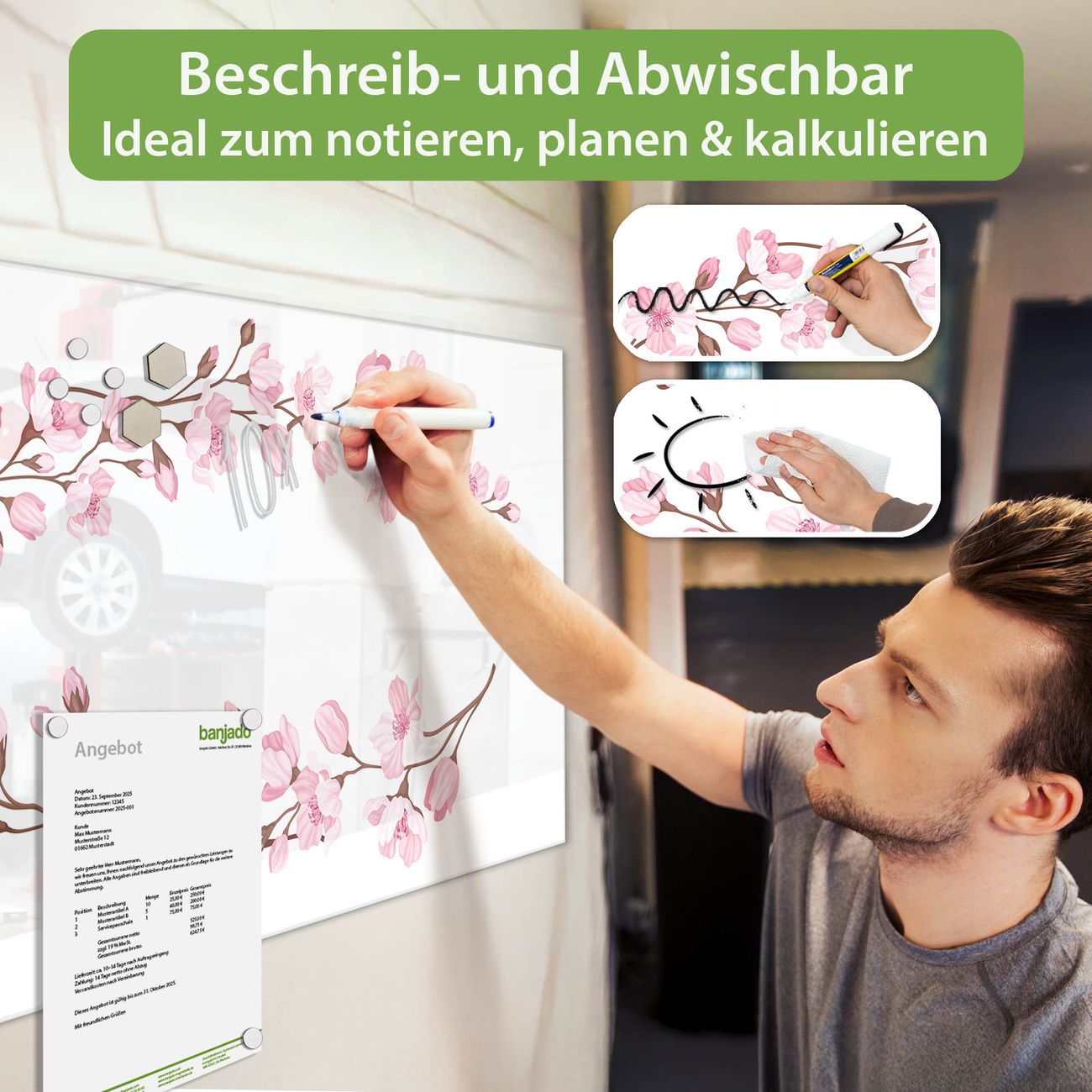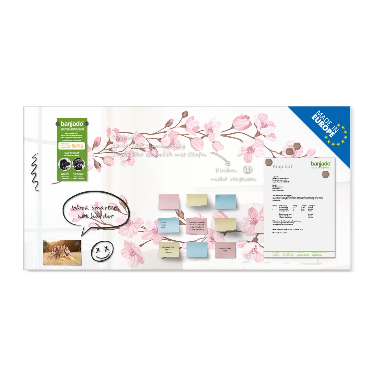 Material: 4mm Sicherheitsglas mit Metallrückwand Eigenschaften: beschreibbar, magnetisch, kratzfest Maße: 100x50x0,6cm, 7,50kg schwer Motiv Nummer 13528 Kirschblütenzauber Zubehör: inklusive 4 Neodym-Magnete