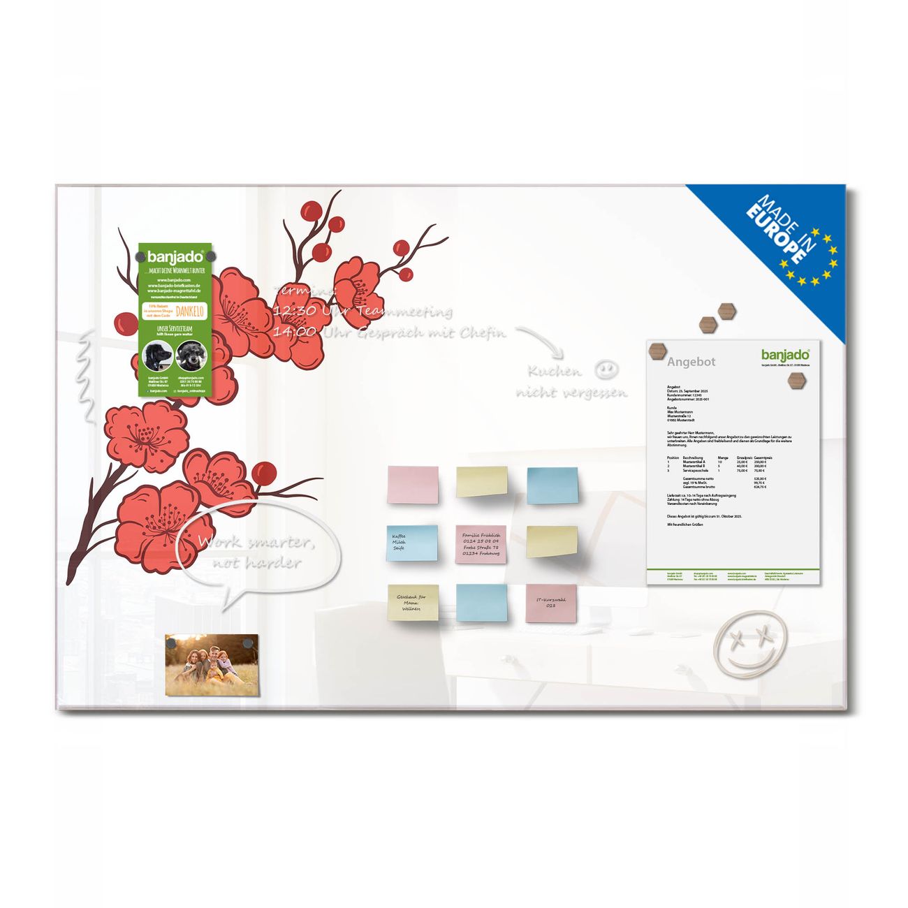 Material: 4mm Sicherheitsglas mit Metallrückwand Eigenschaften: beschreibbar, magnetisch, kratzfest Maße: 120x80x0,6cm, 14,40kg schwer Motiv Nummer 13199 Kirschblütenzweig Zubehör: inklusive 4 Neodym-Magnete