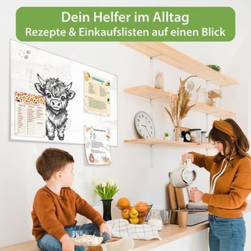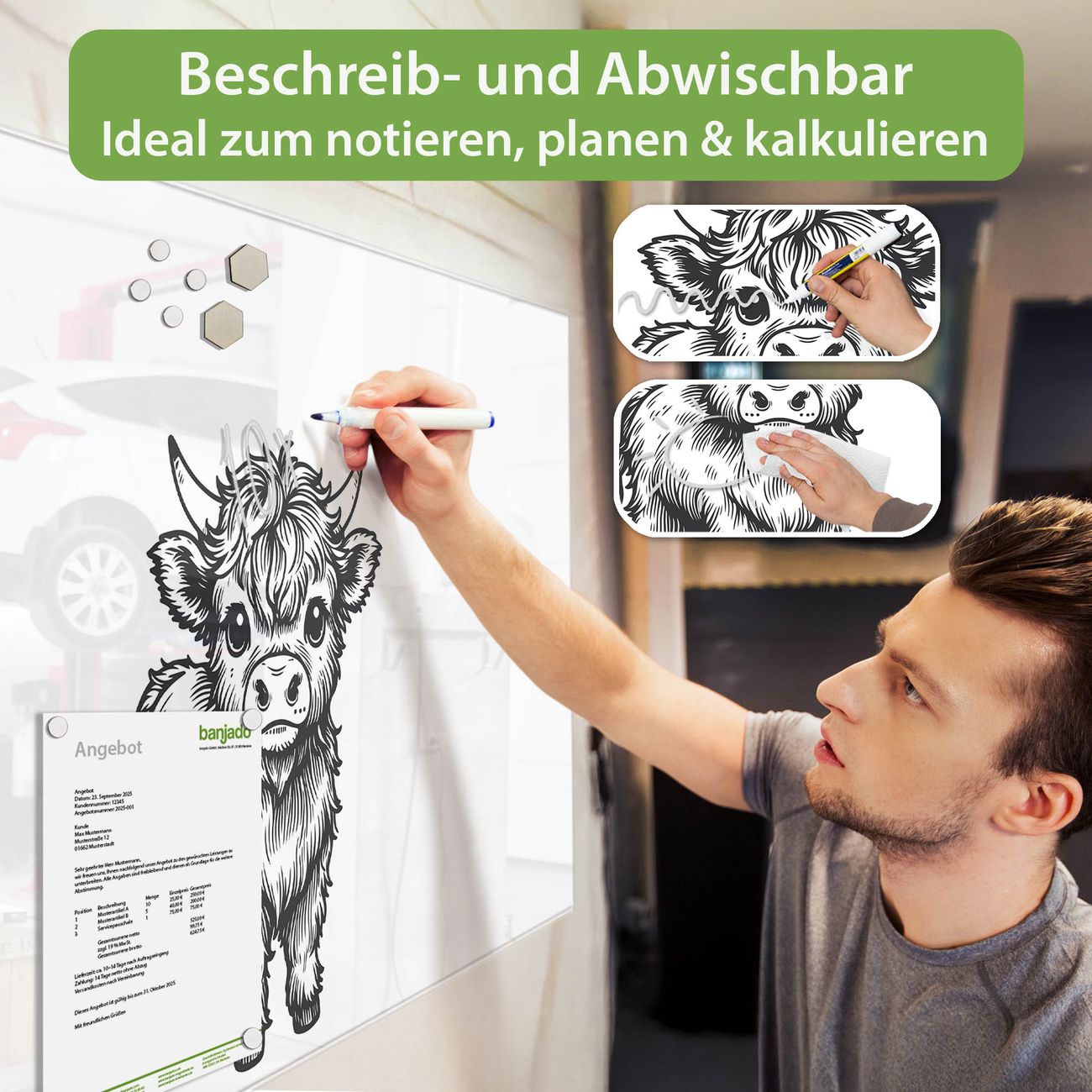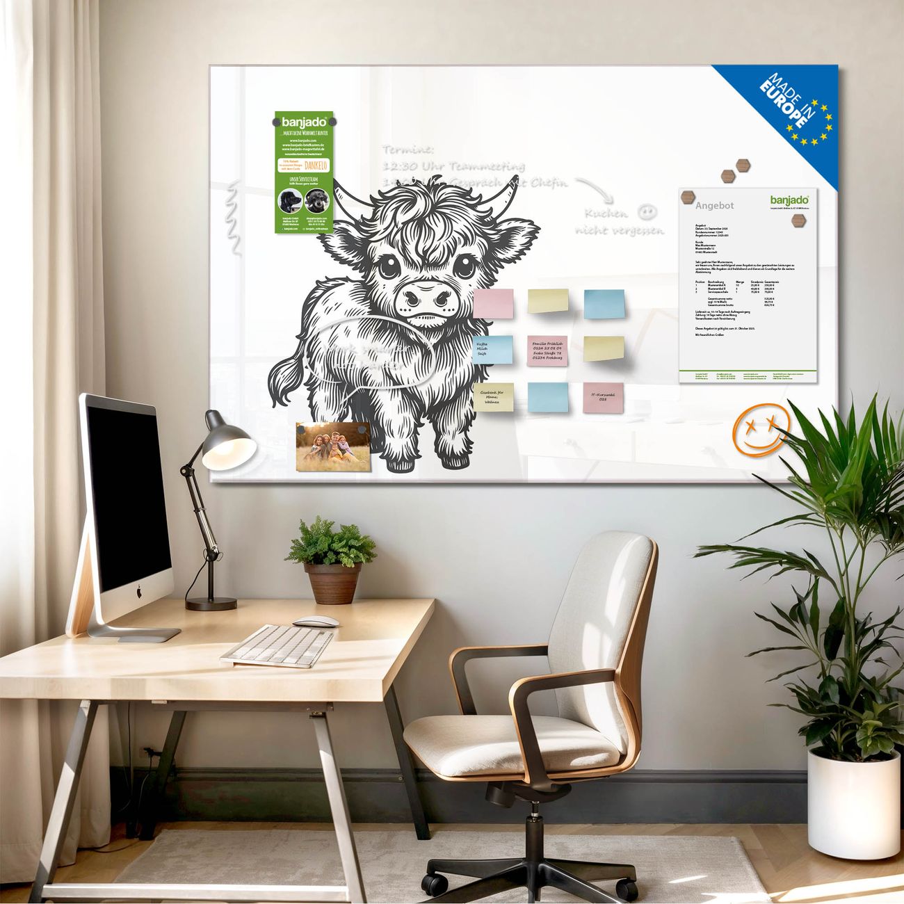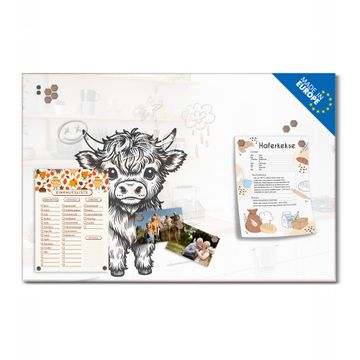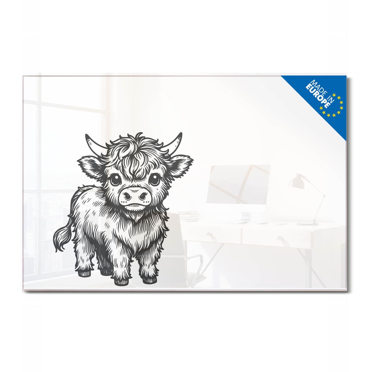 Material: 4mm Sicherheitsglas mit Metallrückwand Eigenschaften: beschreibbar, magnetisch, kratzfest Maße: 75x50x0,6cm, 5,63kg schwer Motiv Nummer 13452 Kleines Hochlandrind Zubehör: inklusive 4 Neodym-Magnete