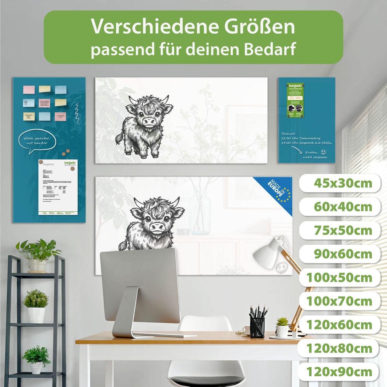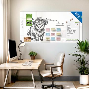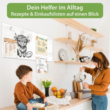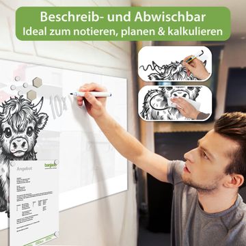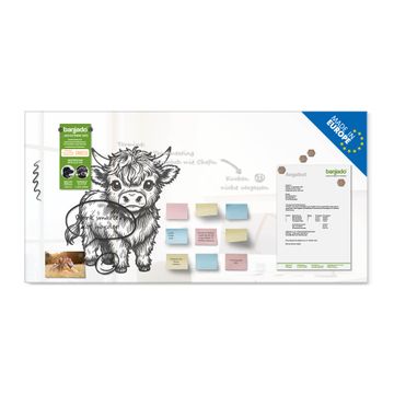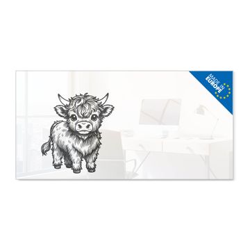 Material: 4mm Sicherheitsglas mit Metallrückwand Eigenschaften: beschreibbar, magnetisch, kratzfest Maße: 100x50x0,6cm, 7,50kg schwer Motiv Nummer 13452 Kleines Hochlandrind Zubehör: inklusive 4 Neodym-Magnete