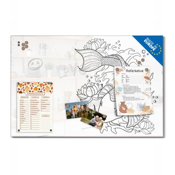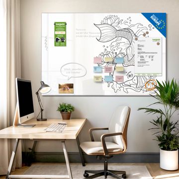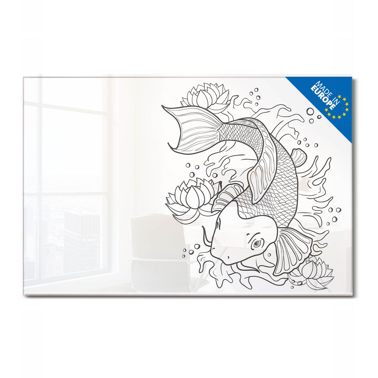 Material: 4mm Sicherheitsglas mit Metallrückwand Eigenschaften: beschreibbar, magnetisch, kratzfest Maße: 45x30x0,6cm, 2,03kg schwer Motiv Nummer 13029 Koi 2 Zubehör: inklusive 4 Neodym-Magnete