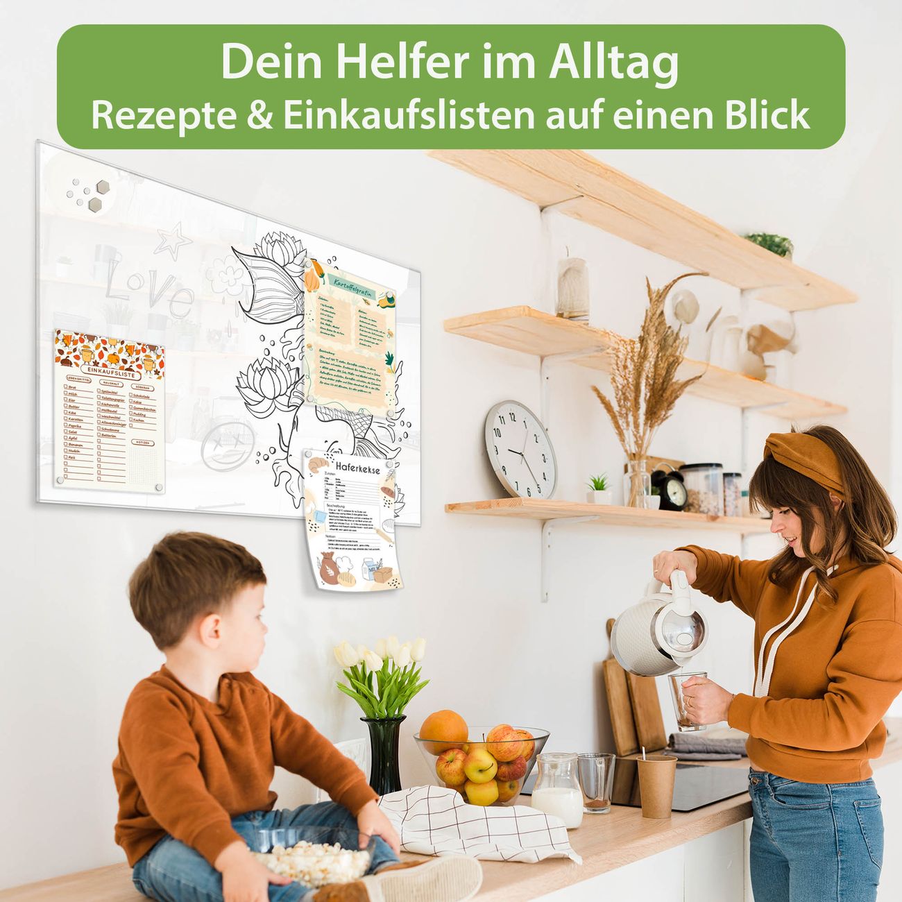 Auf der glatten Glasoberfläche lassen sich Termine, Rezepte oder Notizen ganz einfach mit Kreidestiften festhalten und rückstandslos entfernen. Starke Neodym-Magnete halten Ihre wichtigsten Erinnerungen sicher an Ort und Stelle. So entsteht Ihre ganz persönliche Ideenwand - jeden Tag neu.