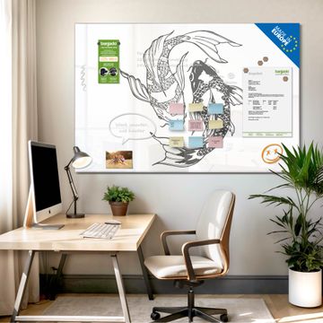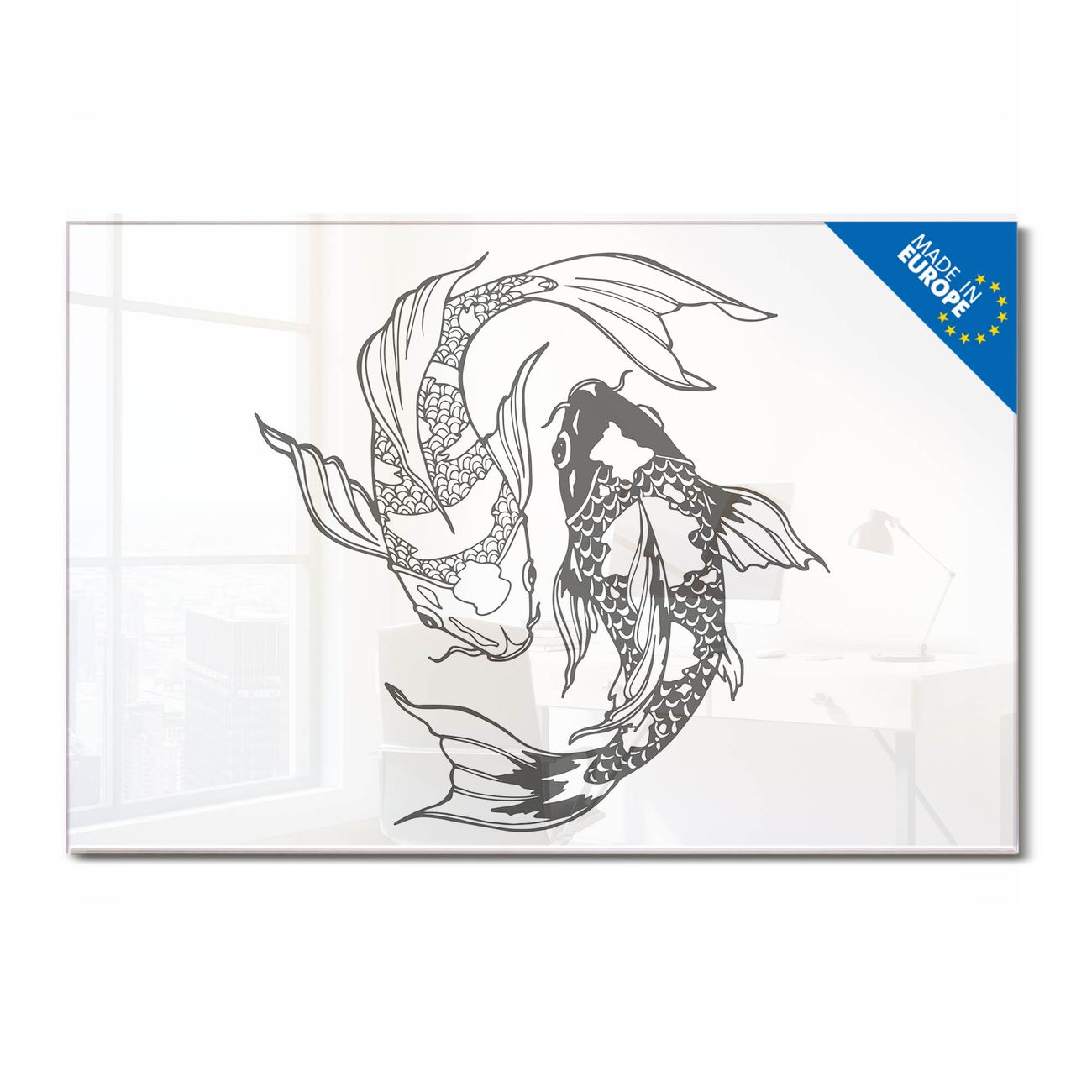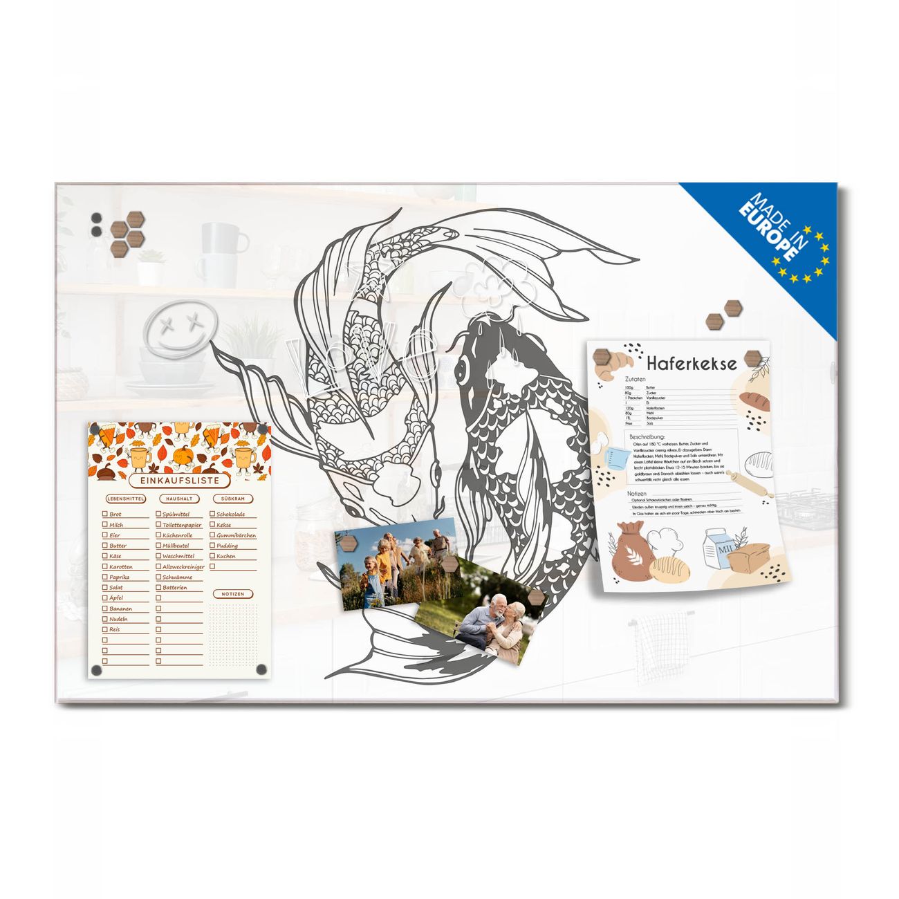 Material: 4mm Sicherheitsglas mit Metallrückwand Eigenschaften: beschreibbar, magnetisch, kratzfest Maße: 90x60x0,6cm, 8,10kg schwer Motiv Nummer 13028 Koi Paar 3 Zubehör: inklusive 4 Neodym-Magnete