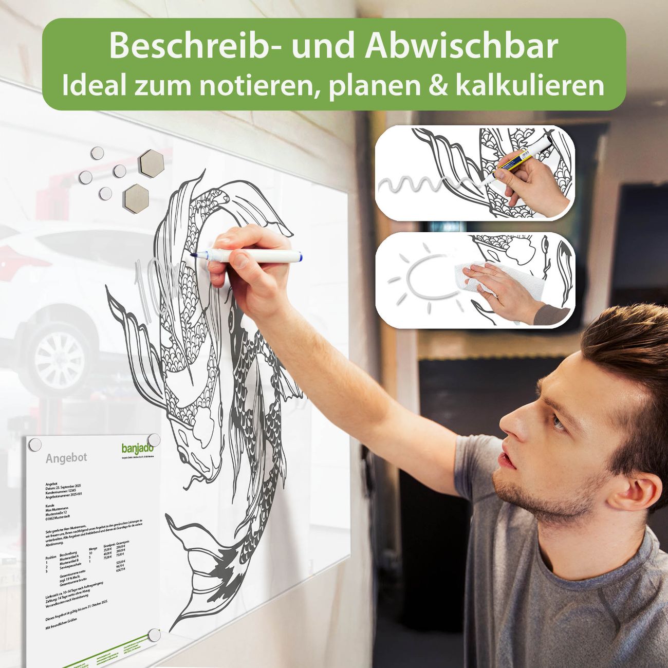 Jede Glas Magnettafel wird in unserer Werkstatt von Hand gefertigt und sorgfältig geprüft. So erhalten Sie ein echtes Qualitätsprodukt, das Funktion und Ästhetik perfekt vereint.?? Warum banjado?