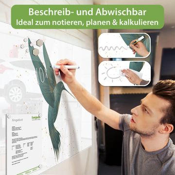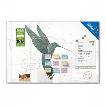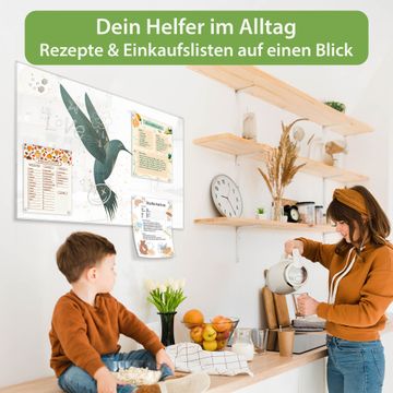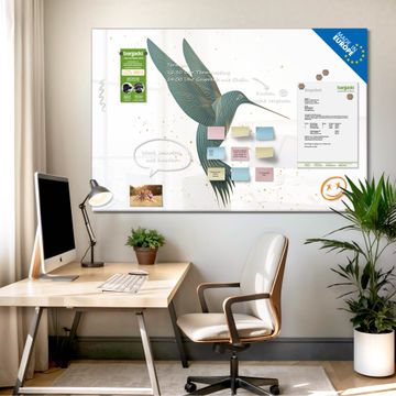 Material: 4mm Sicherheitsglas mit Metallrückwand Eigenschaften: beschreibbar, magnetisch, kratzfest Maße: 120x80x0,6cm, 14,40kg schwer Motiv Nummer 13039 Kolibri 5 Zubehör: inklusive 4 Neodym-Magnete
