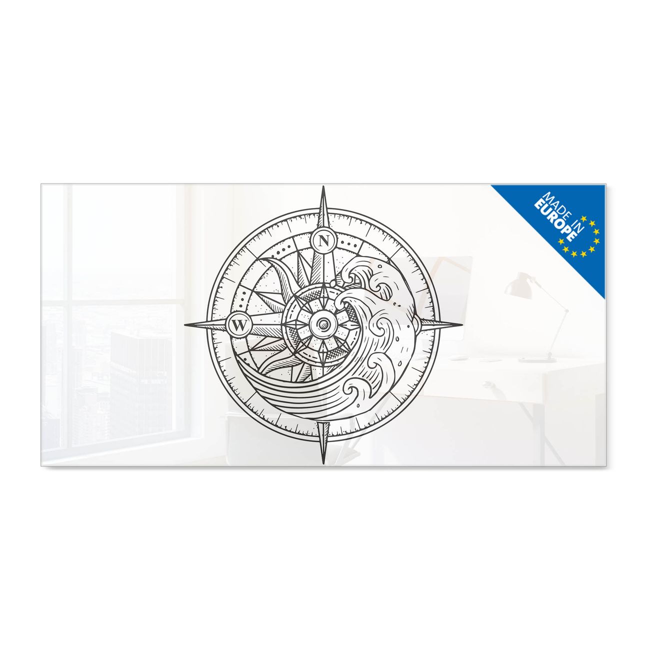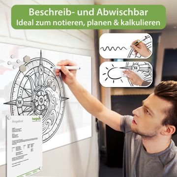 Material: 4mm Sicherheitsglas mit Metallrückwand Eigenschaften: beschreibbar, magnetisch, kratzfest Maße: 100x50x0,6cm, 7,50kg schwer Motiv Nummer 13056 Kompass 2 Zubehör: inklusive 4 Neodym-Magnete