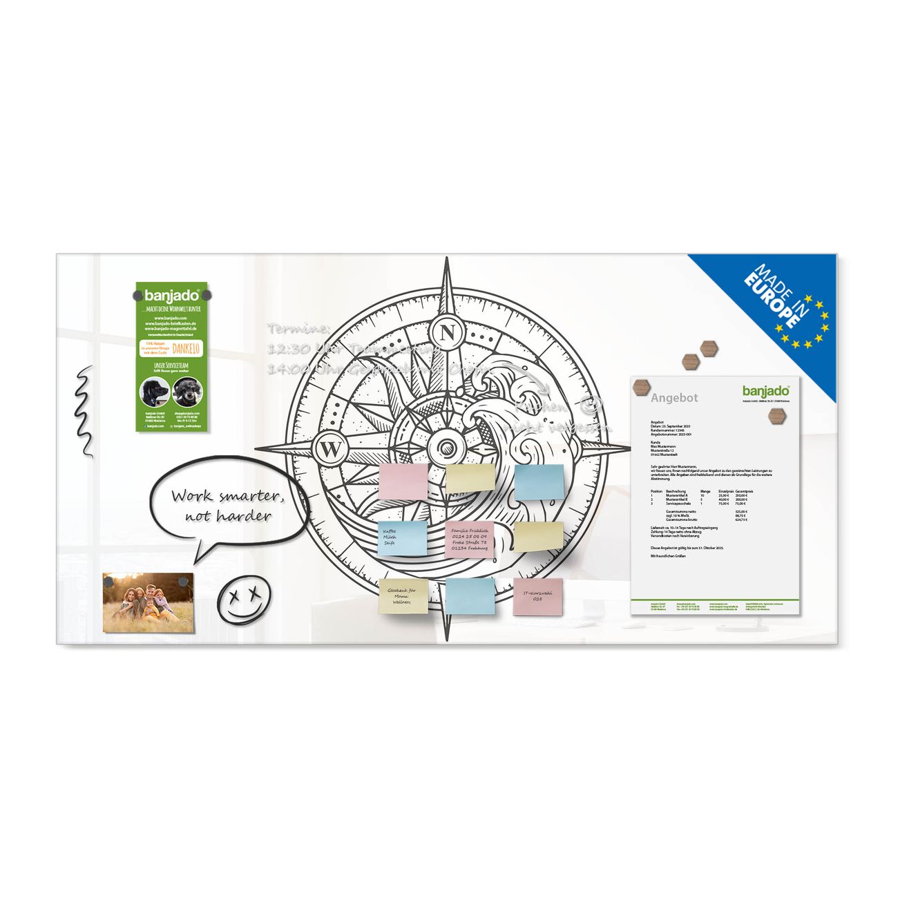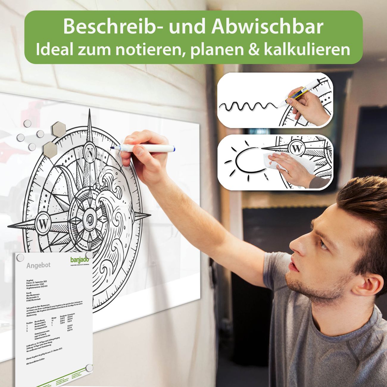 Jede Glas Magnettafel wird in unserer Werkstatt von Hand gefertigt und sorgfältig geprüft. So erhalten Sie ein echtes Qualitätsprodukt, das Funktion und Ästhetik perfekt vereint.?? Warum banjado?