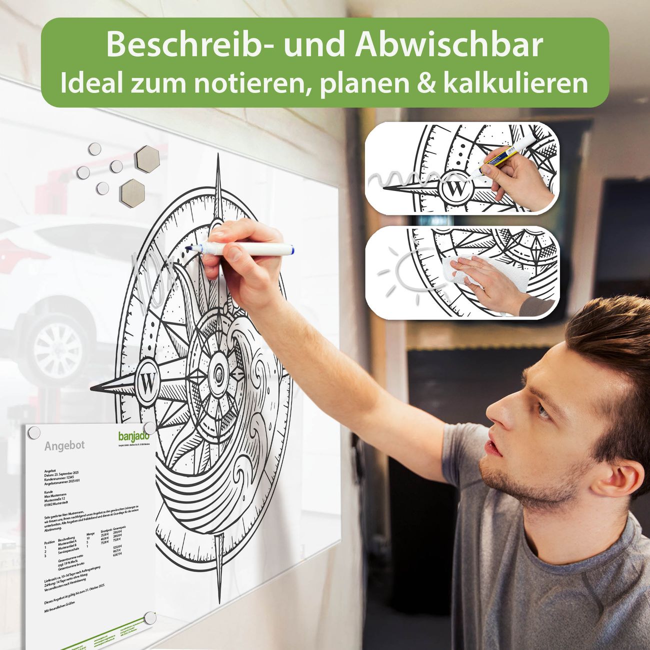 Glas Magnettafel im Querformat Motiv Kompass 2
