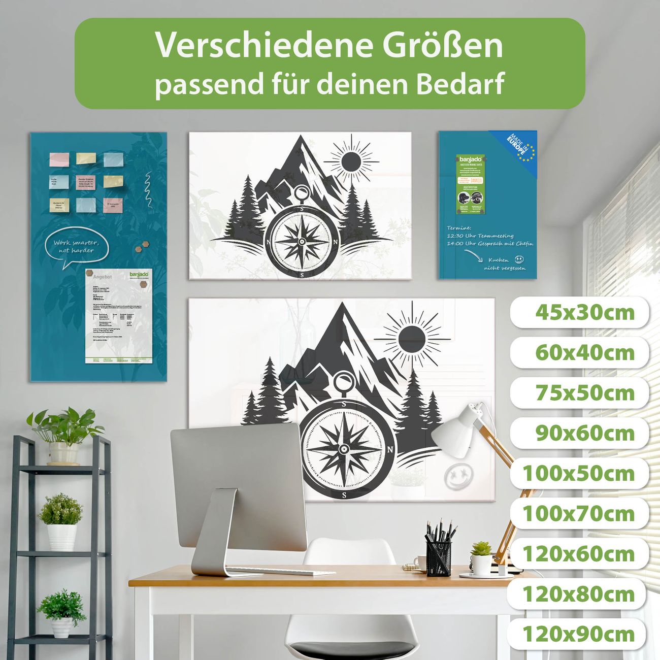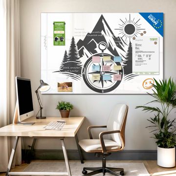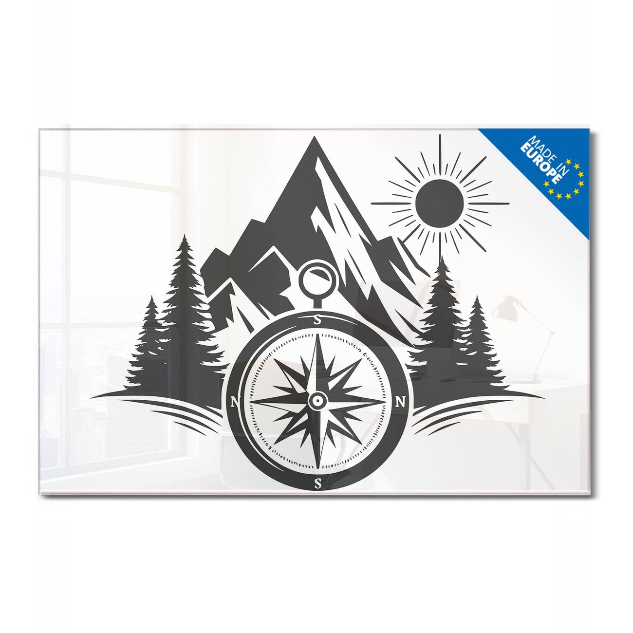 Material: 4mm Sicherheitsglas mit Metallrückwand Eigenschaften: beschreibbar, magnetisch, kratzfest Maße: 120x80x0,6cm, 14,40kg schwer Motiv Nummer 13276 Kompass in der Wildnis Zubehör: inklusive 4 Neodym-Magnete