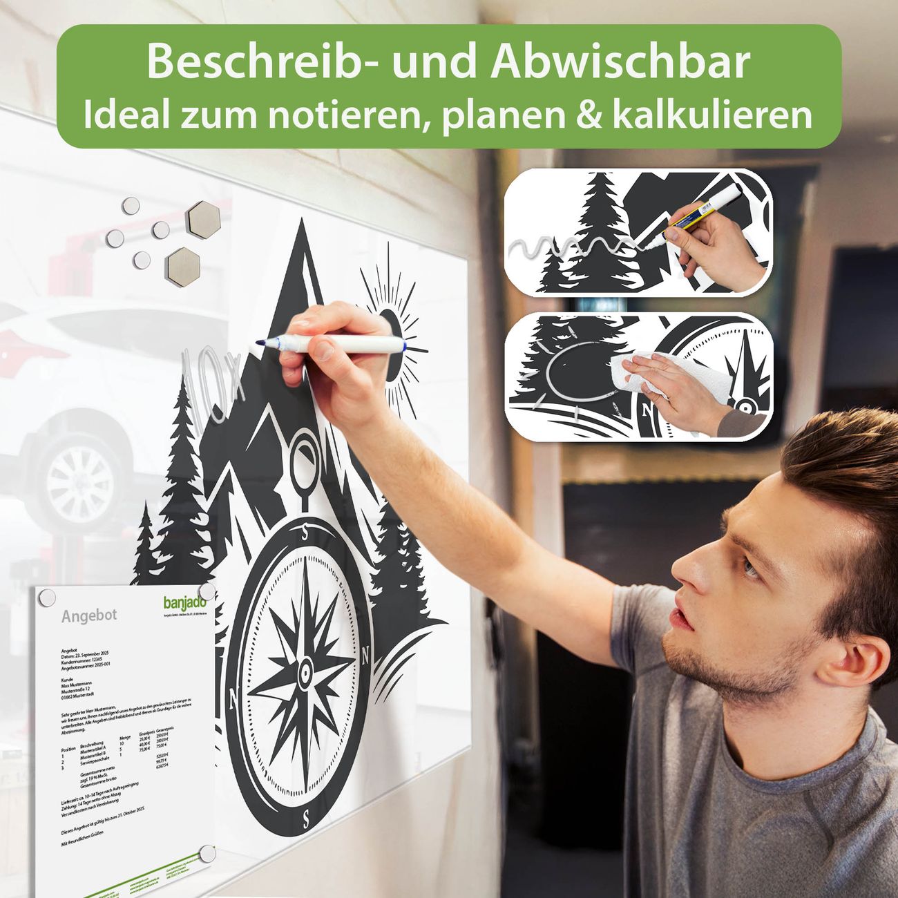 Jede Glas Magnettafel wird in unserer Werkstatt von Hand gefertigt und sorgfältig geprüft. So erhalten Sie ein echtes Qualitätsprodukt, das Funktion und Ästhetik perfekt vereint.?? Warum banjado?