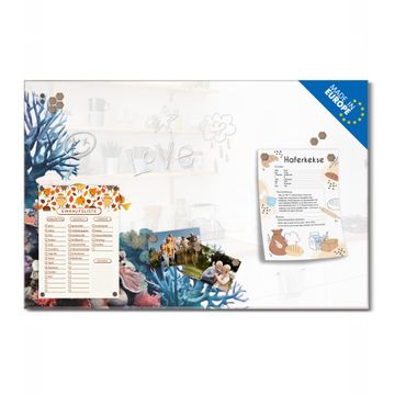 Material: 4mm Sicherheitsglas mit Metallrückwand Eigenschaften: beschreibbar, magnetisch, kratzfest Maße: 75x50x0,6cm, 5,63kg schwer Motiv Nummer 13315 Korallenriff und Fische Zubehör: inklusive 4 Neodym-Magnete
