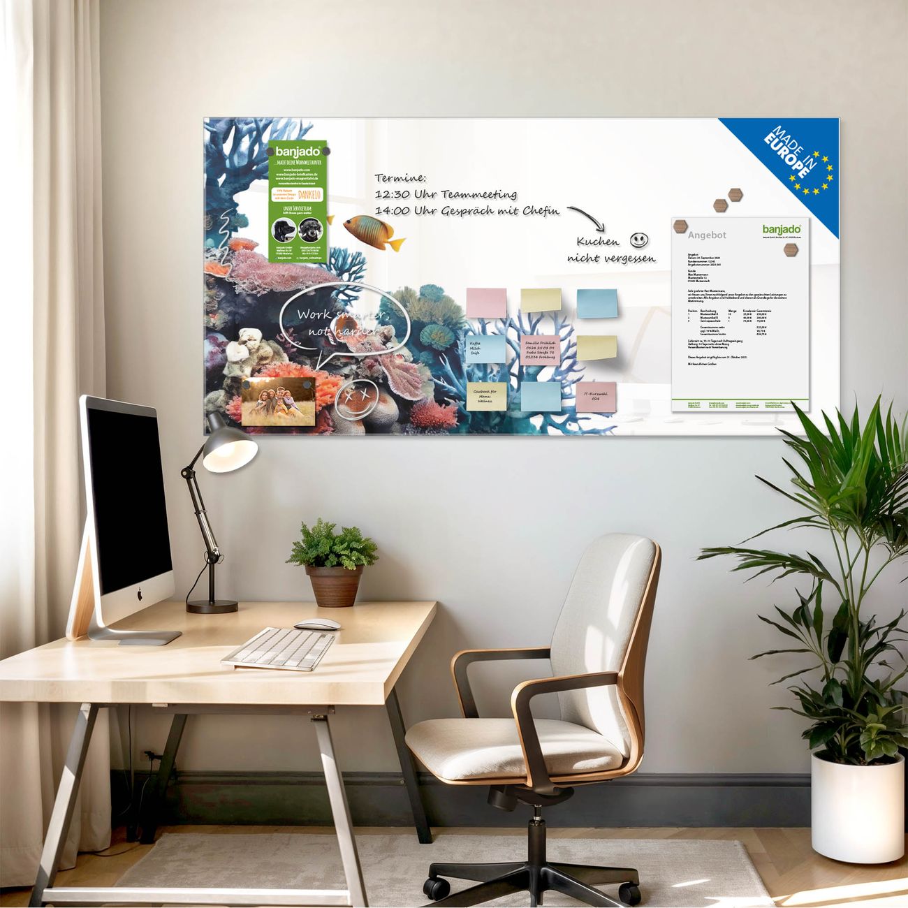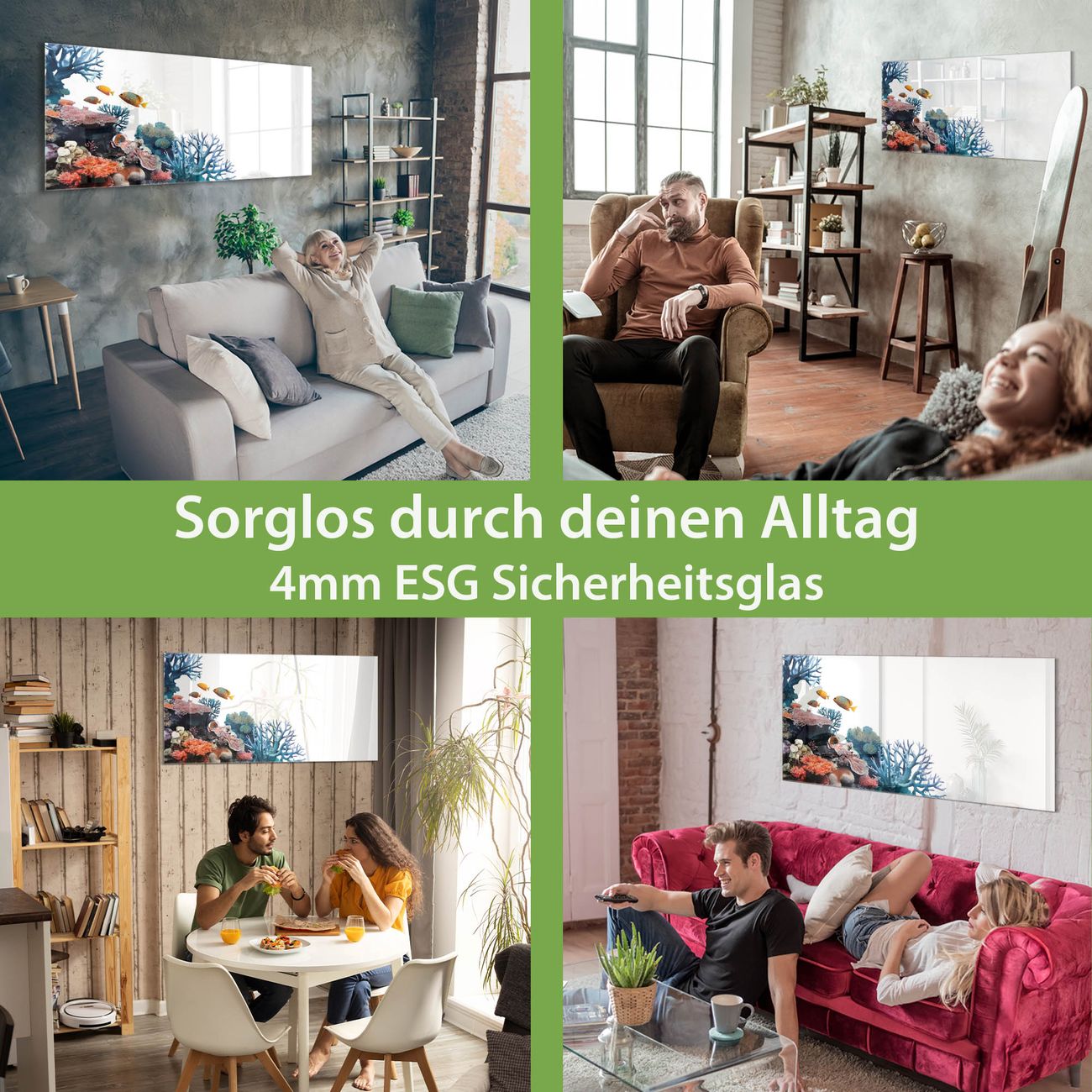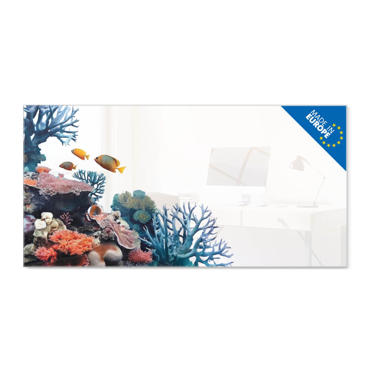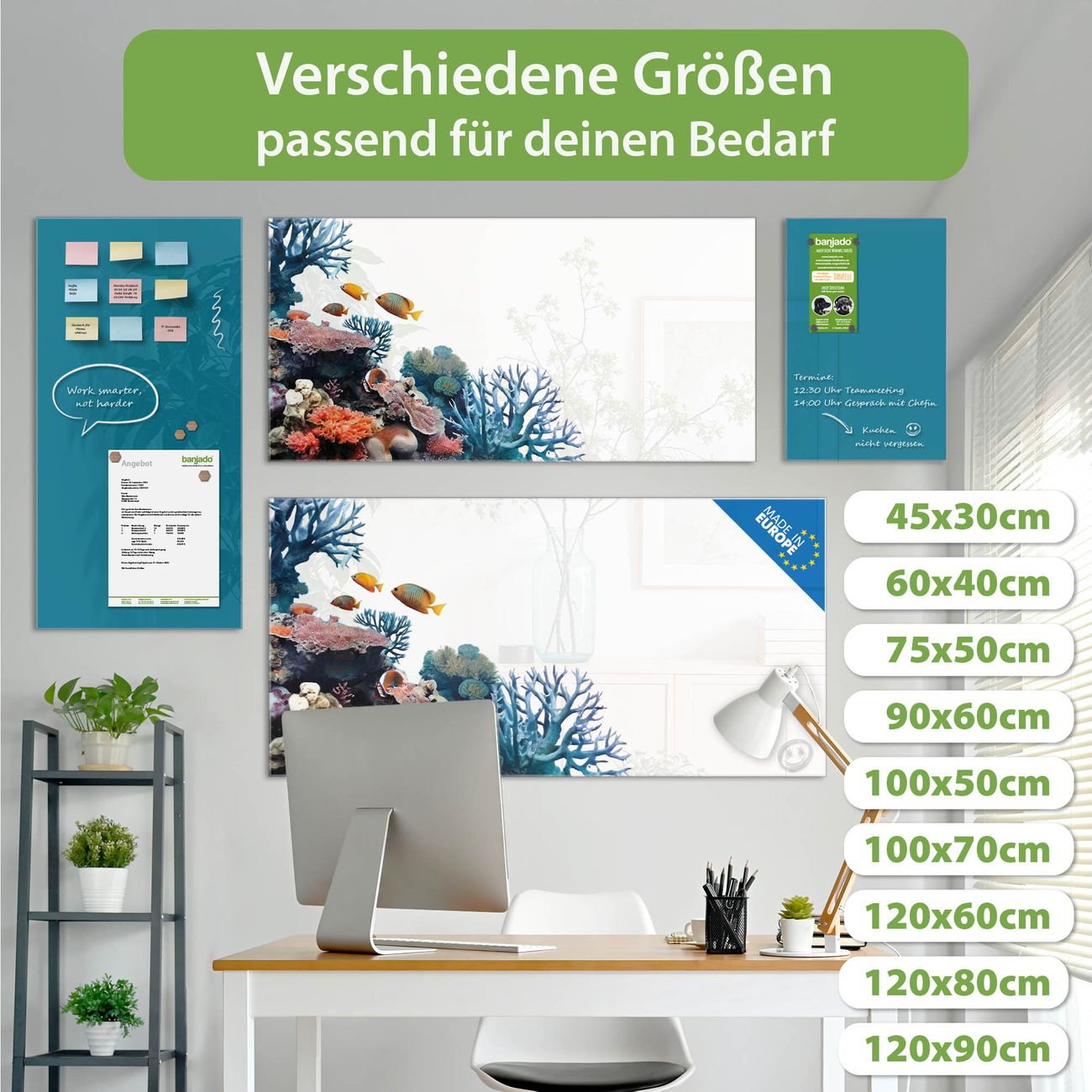 Material: 4mm Sicherheitsglas mit Metallrückwand Eigenschaften: beschreibbar, magnetisch, kratzfest Maße: 100x50x0,6cm, 7,50kg schwer Motiv Nummer 13315 Korallenriff und Fische Zubehör: inklusive 4 Neodym-Magnete