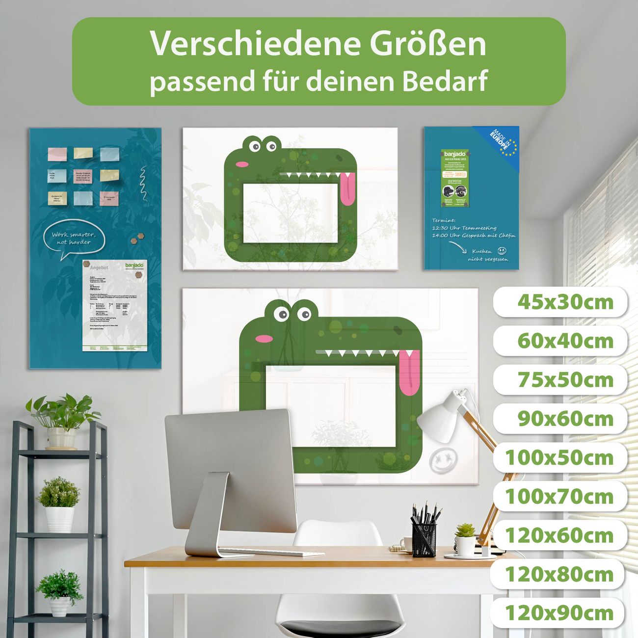 Material: 4mm Sicherheitsglas mit Metallrückwand Eigenschaften: beschreibbar, magnetisch, kratzfest Maße: 120x80x0,6cm, 14,40kg schwer Motiv Nummer 13259 Krokodil-Bilderrahmen Zubehör: inklusive 4 Neodym-Magnete