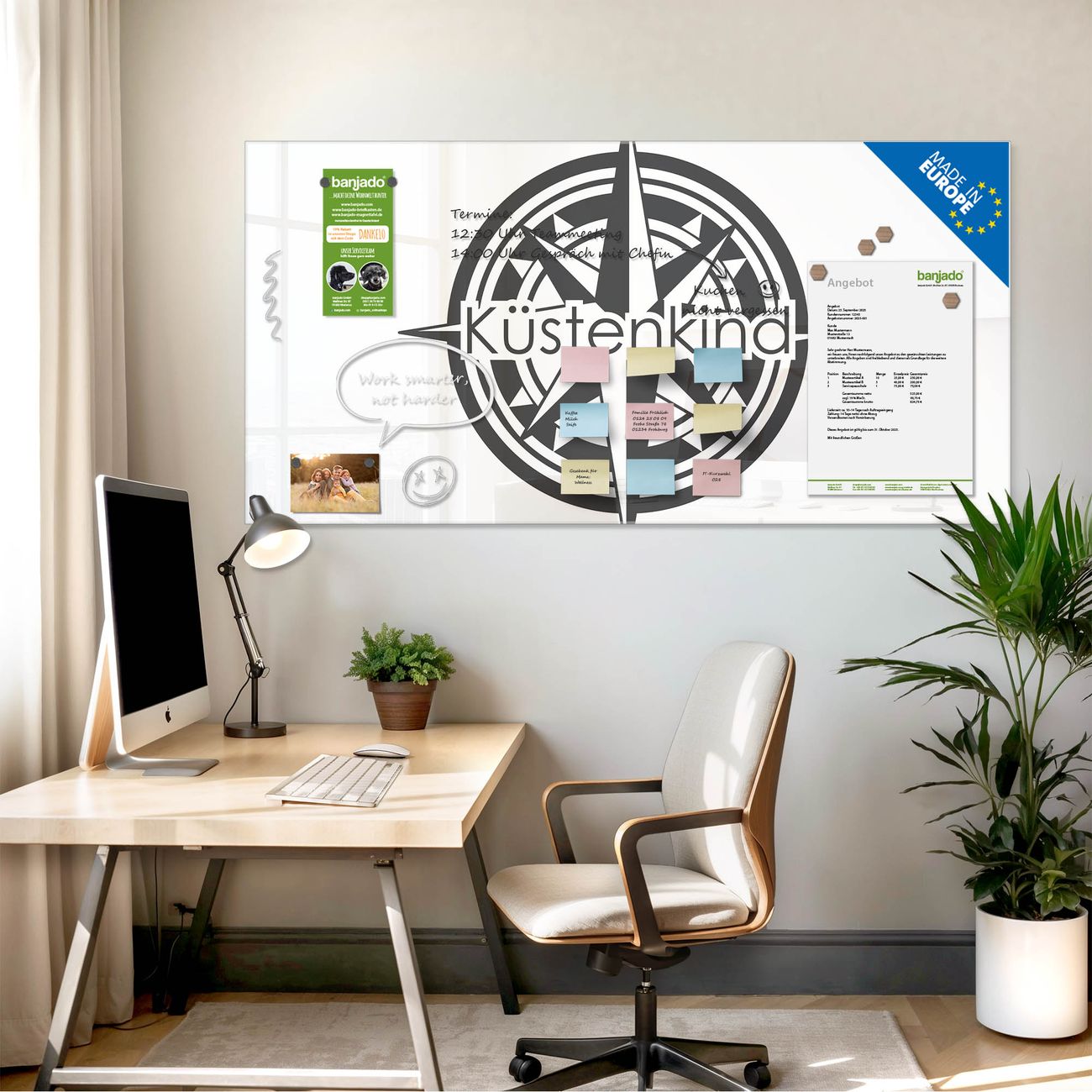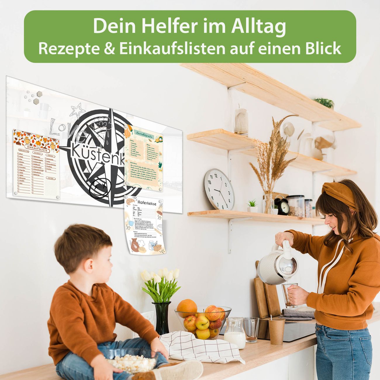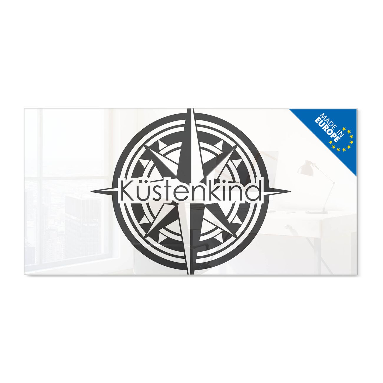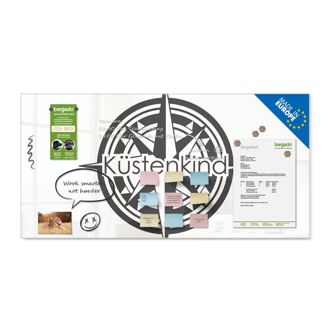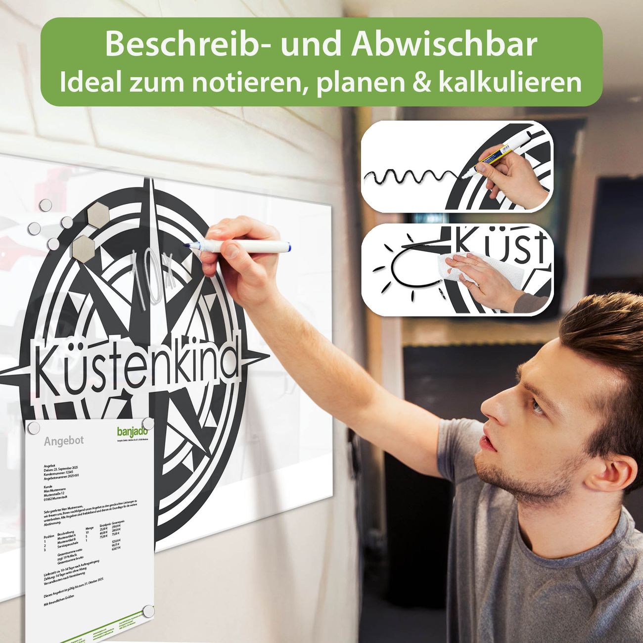 Material: 4mm Sicherheitsglas mit Metallrückwand Eigenschaften: beschreibbar, magnetisch, kratzfest Maße: 100x50x0,6cm, 7,50kg schwer Motiv Nummer 13115 Küstenkind Kompass 2 Zubehör: inklusive 4 Neodym-Magnete