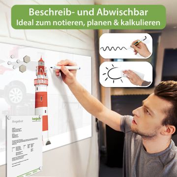 Material: 4mm Sicherheitsglas mit Metallrückwand Eigenschaften: beschreibbar, magnetisch, kratzfest Maße: 100x50x0,6cm, 7,50kg schwer Motiv Nummer 13287 Küstenwächter Zubehör: inklusive 4 Neodym-Magnete
