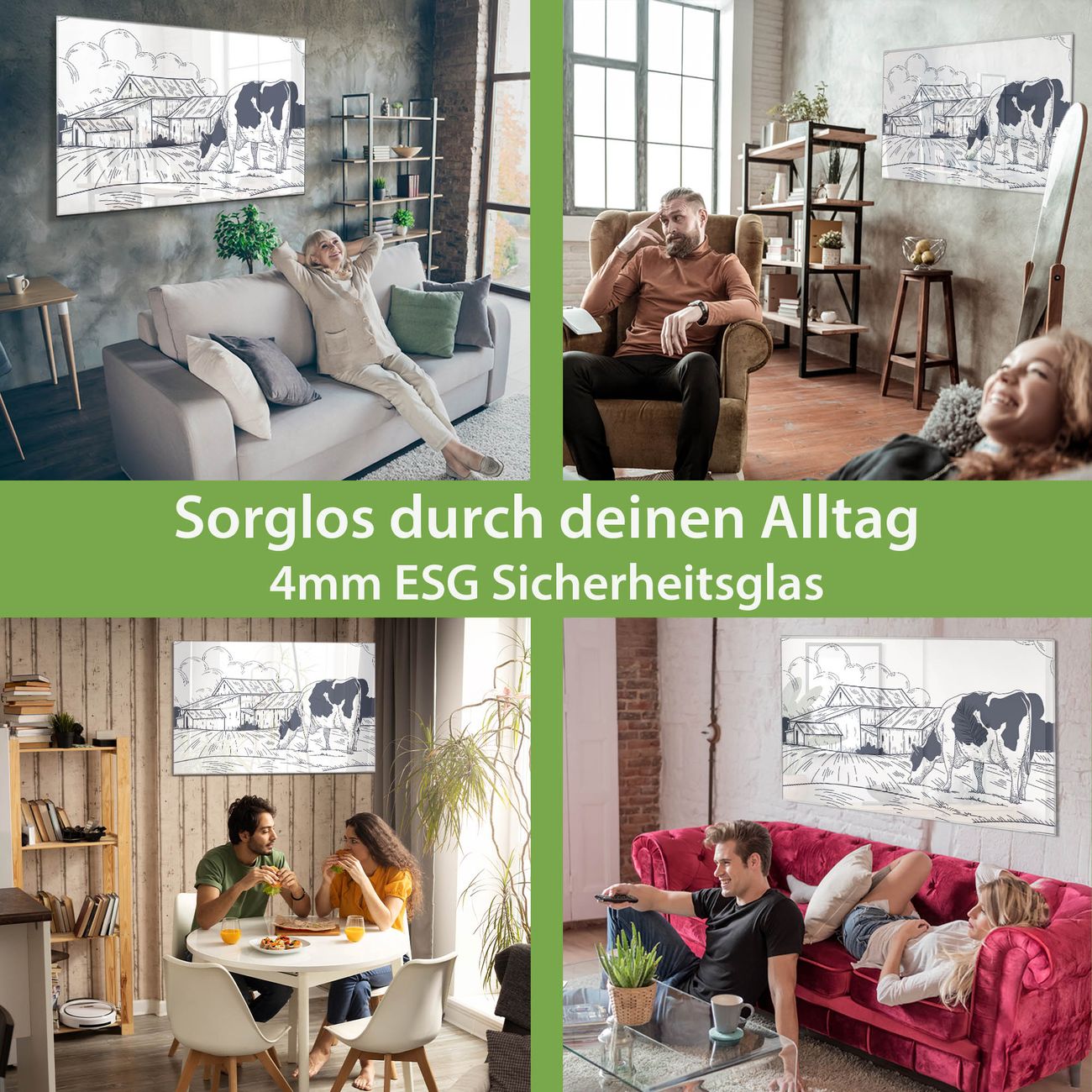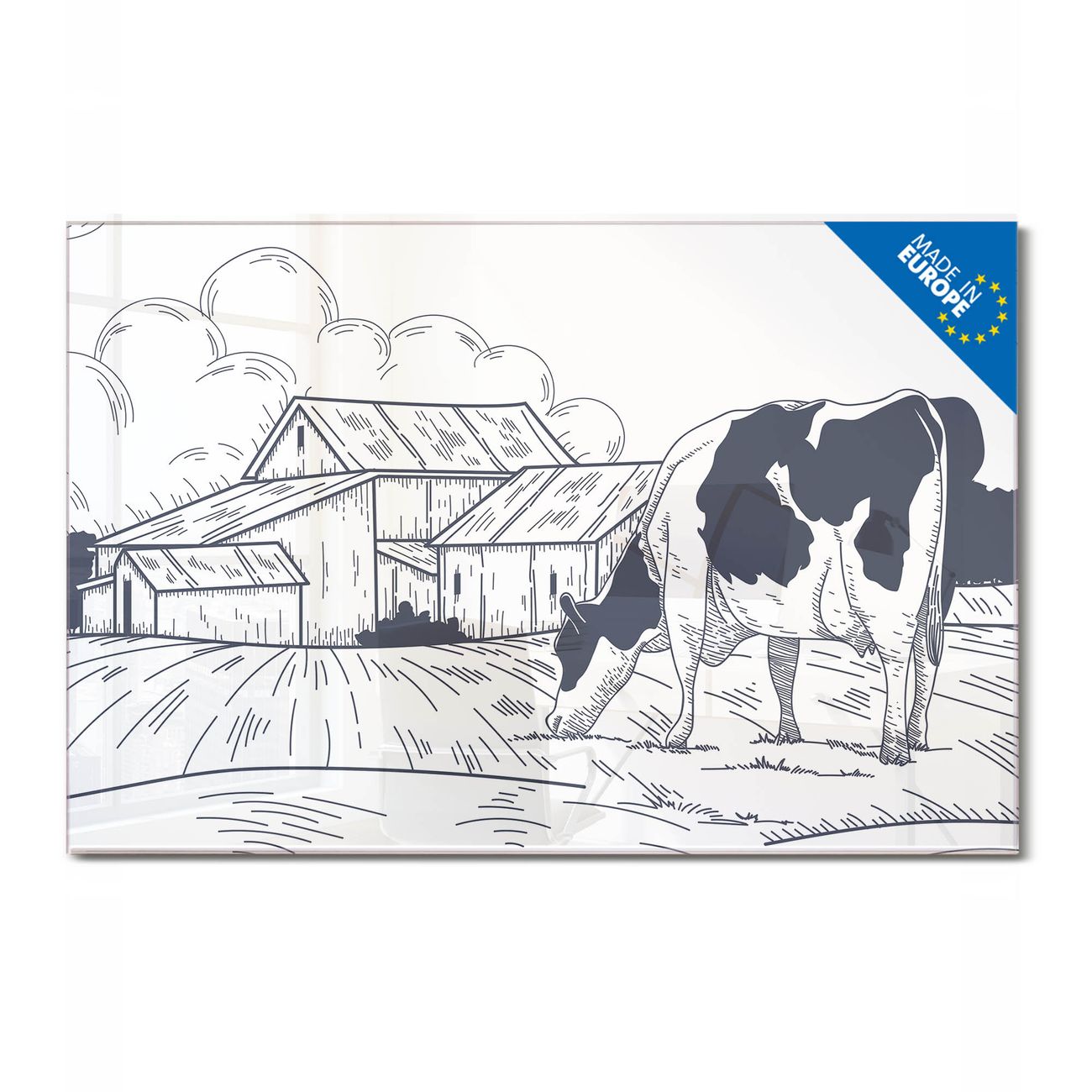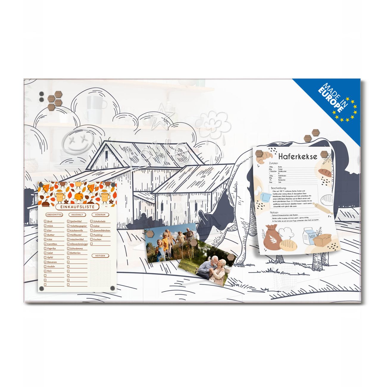 Material: 4mm Sicherheitsglas mit Metallrückwand Eigenschaften: beschreibbar, magnetisch, kratzfest Maße: 75x50x0,6cm, 5,63kg schwer Motiv Nummer 13151 Ländliche Idylle mit Kuh Zubehör: inklusive 4 Neodym-Magnete