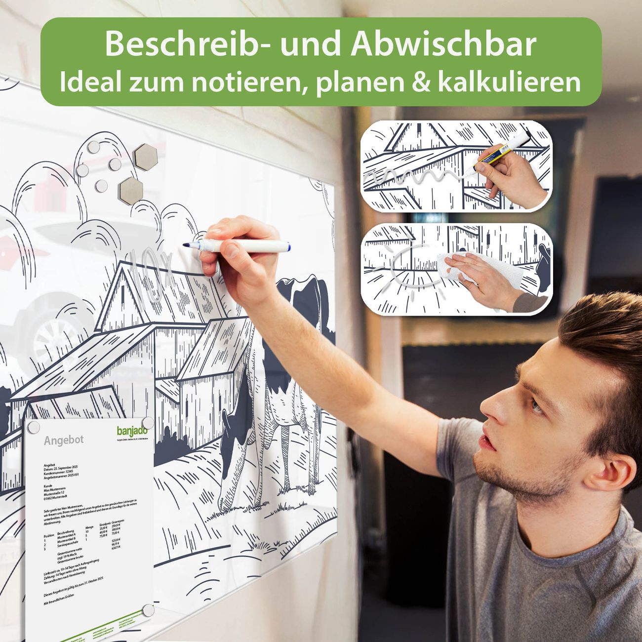 Jede Glas Magnettafel wird in unserer Werkstatt von Hand gefertigt und sorgfältig geprüft. So erhalten Sie ein echtes Qualitätsprodukt, das Funktion und Ästhetik perfekt vereint.?? Warum banjado?