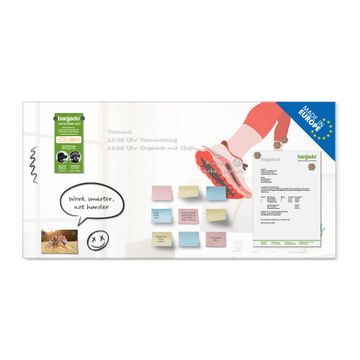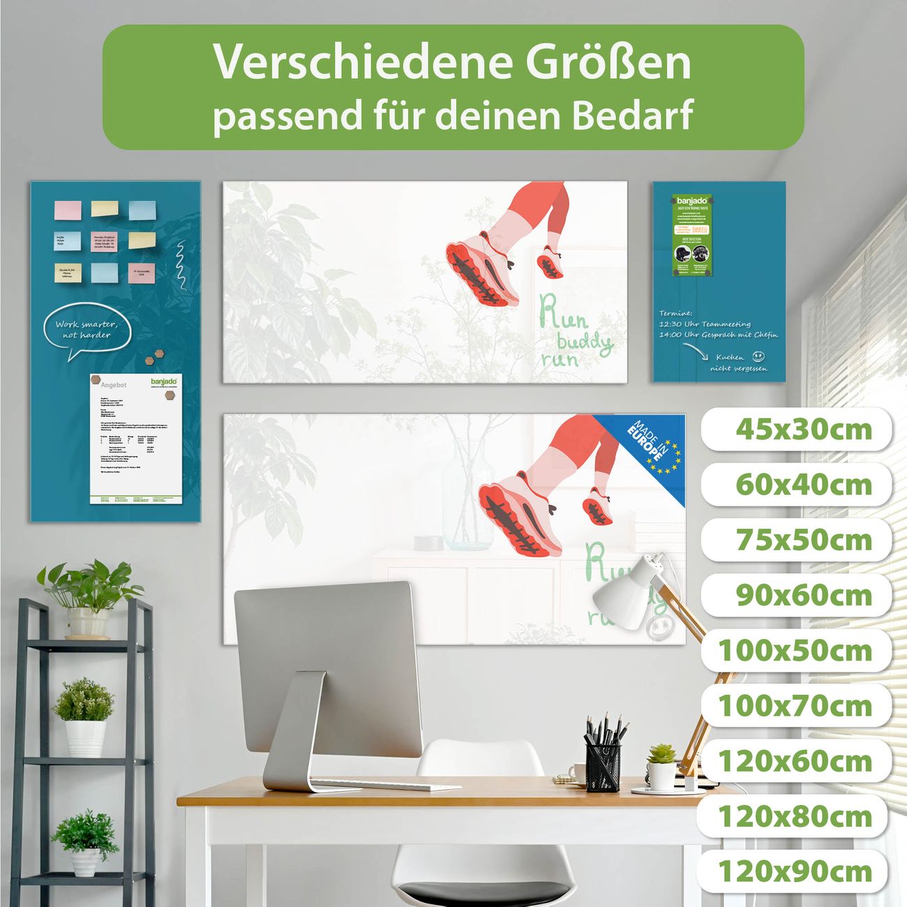 Material: 4mm Sicherheitsglas mit Metallrückwand Eigenschaften: beschreibbar, magnetisch, kratzfest Maße: 100x50x0,6cm, 7,50kg schwer Motiv Nummer 13373 Laufschuh Bewegung Zubehör: inklusive 4 Neodym-Magnete