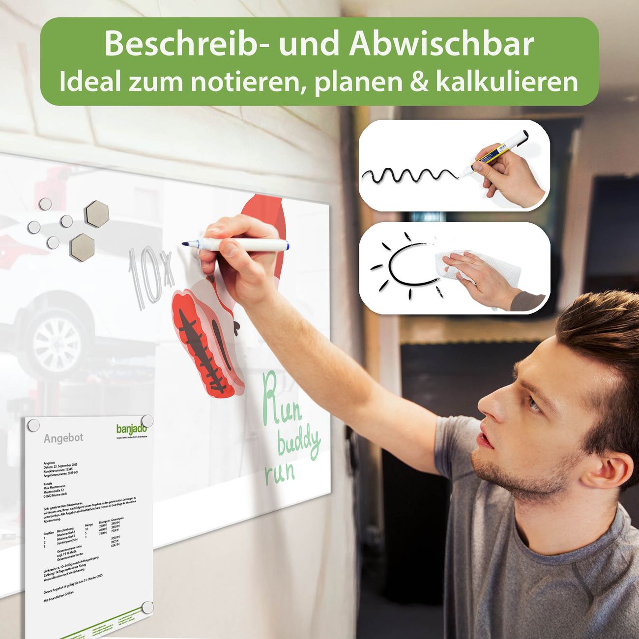 Bitte beachten Sie, dass ausschliessliche spezielle Magnete an der Glastafel haften. Wir empfehlen banjado Neodym Magnete, diese sind durch uns auf Wirksamkeit geprüft.