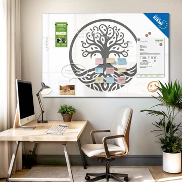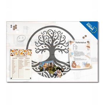 Material: 4mm Sicherheitsglas mit Metallrückwand Eigenschaften: beschreibbar, magnetisch, kratzfest Maße: 90x60x0,6cm, 8,10kg schwer Motiv Nummer 13338 Lebensbaum Silhouette 2 Zubehör: inklusive 4 Neodym-Magnete