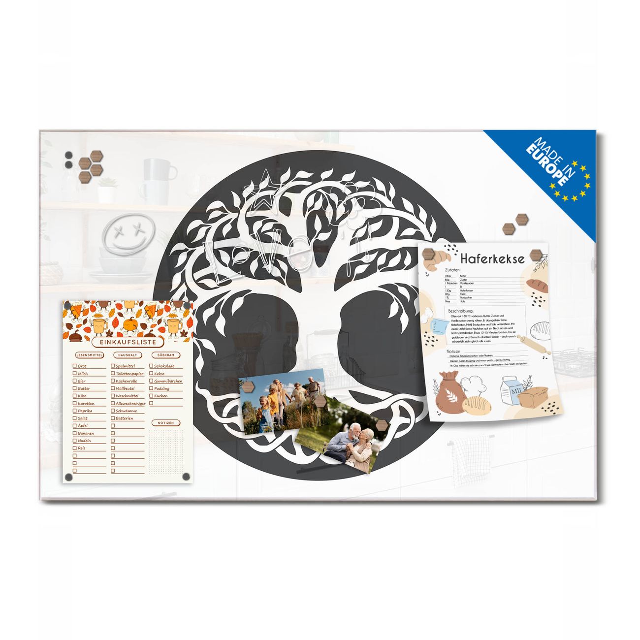 Ein Stück Design, das Ihren Alltag organisiert. Schreiben, heften, inspirieren - alles an einem Ort. Qualität, die man spürt. Montage leicht gemacht. Handwerk mit Herz - veredelt in Sachsen. Einzigartiges Design mit Motiv Motiv Lebensbaum Silhouette Beschreibbare Glasoberfläche, leicht zu reinigen Starke Magnetkraft durch Stahlrückwand Inklusive 4 Neodym-Magneten Flexible Montageoptionen Handveredelt in Sachsen - Qualität, die bleibt