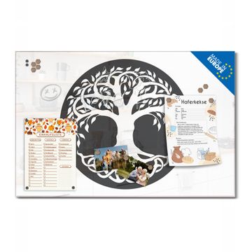 Material: 4mm Sicherheitsglas mit Metallrückwand Eigenschaften: beschreibbar, magnetisch, kratzfest Maße: 75x50x0,6cm, 5,63kg schwer Motiv Nummer 13335 Lebensbaum Silhouette Zubehör: inklusive 4 Neodym-Magnete