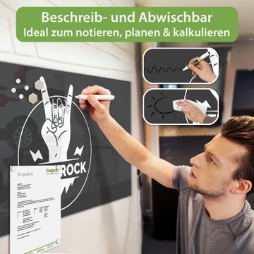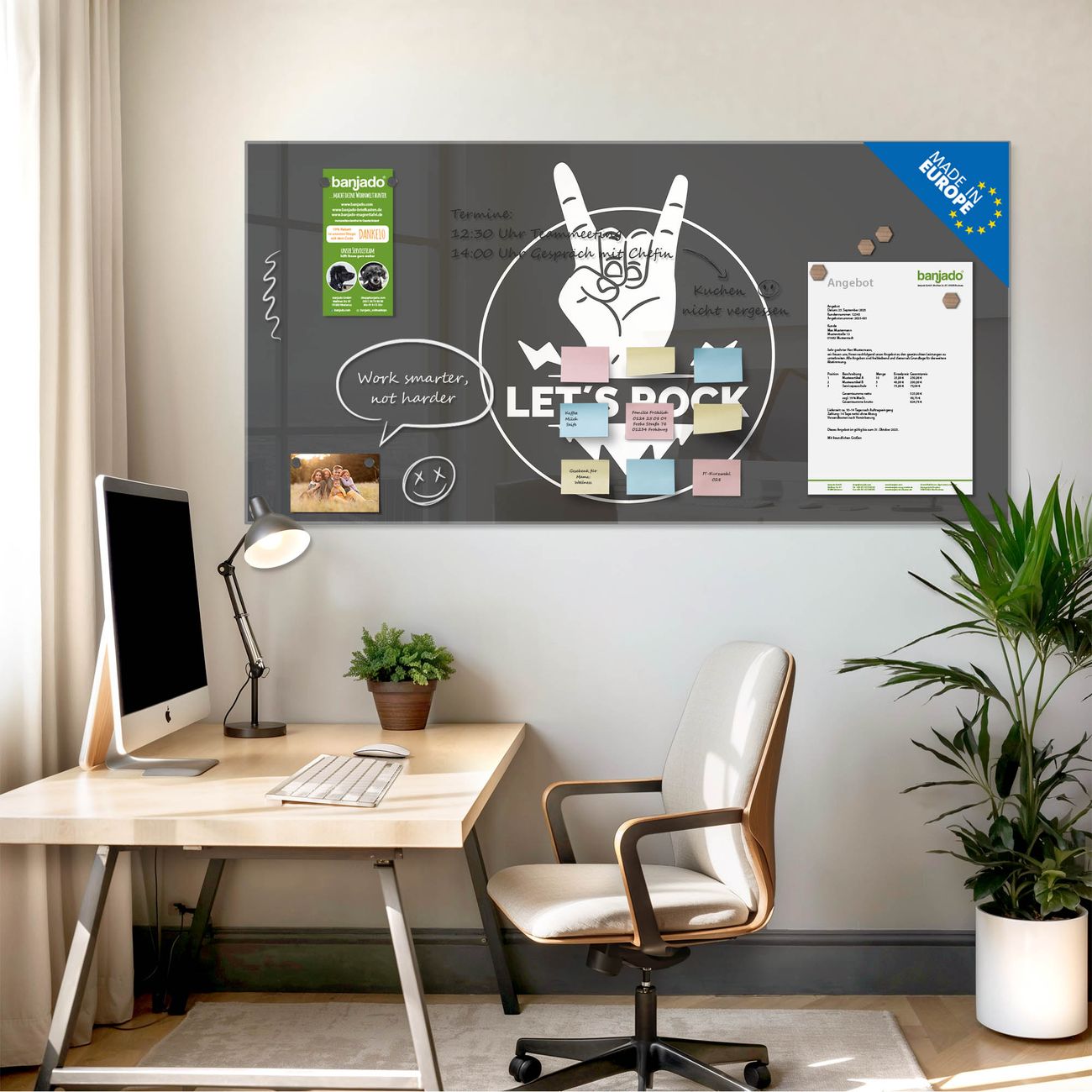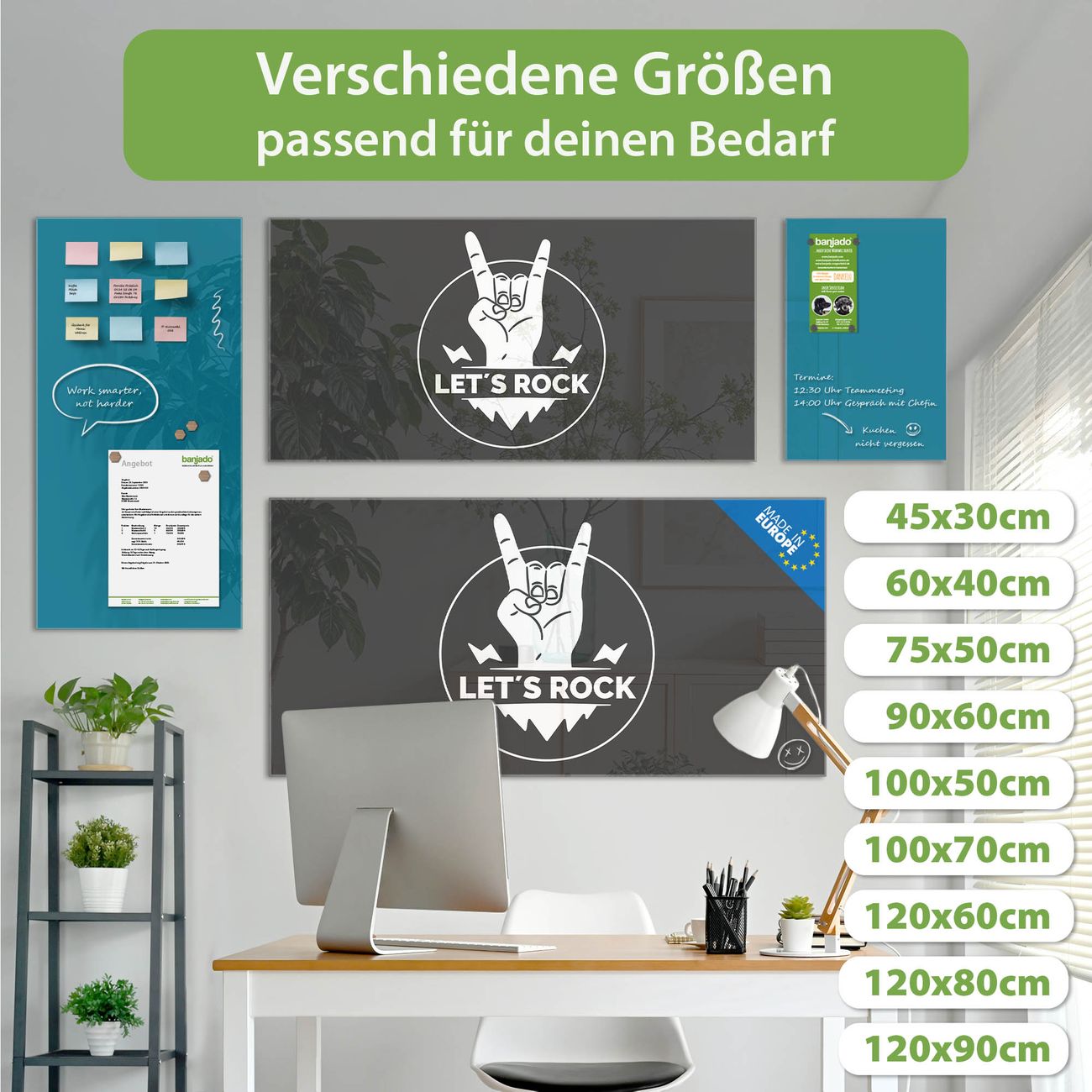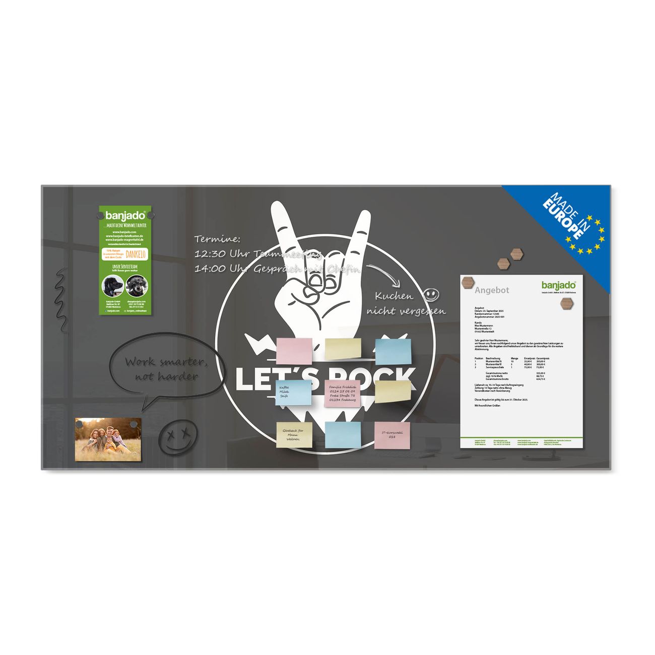 Material: 4mm Sicherheitsglas mit Metallrückwand Eigenschaften: beschreibbar, magnetisch, kratzfest Maße: 100x50x0,6cm, 7,50kg schwer Motiv Nummer 13176 Let's Rock Zubehör: inklusive 4 Neodym-Magnete