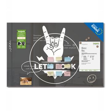 Material: 4mm Sicherheitsglas mit Metallrückwand Eigenschaften: beschreibbar, magnetisch, kratzfest Maße: 120x80x0,6cm, 14,40kg schwer Motiv Nummer 13176 Let's Rock Zubehör: inklusive 4 Neodym-Magnete