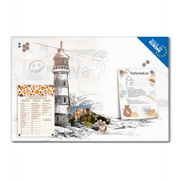 Material: 4mm Sicherheitsglas mit Metallrückwand Eigenschaften: beschreibbar, magnetisch, kratzfest Maße: 75x50x0,6cm, 5,63kg schwer Motiv Nummer 13288 Leuchtturm in der Brandung Zubehör: inklusive 4 Neodym-Magnete