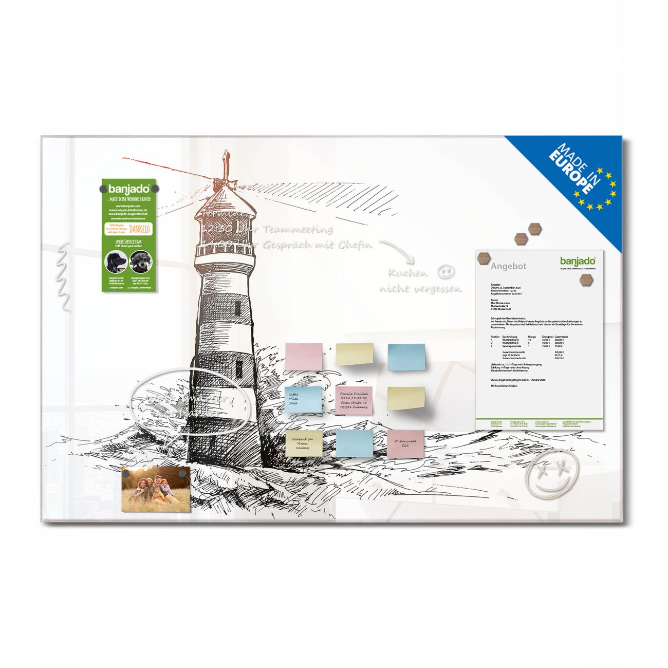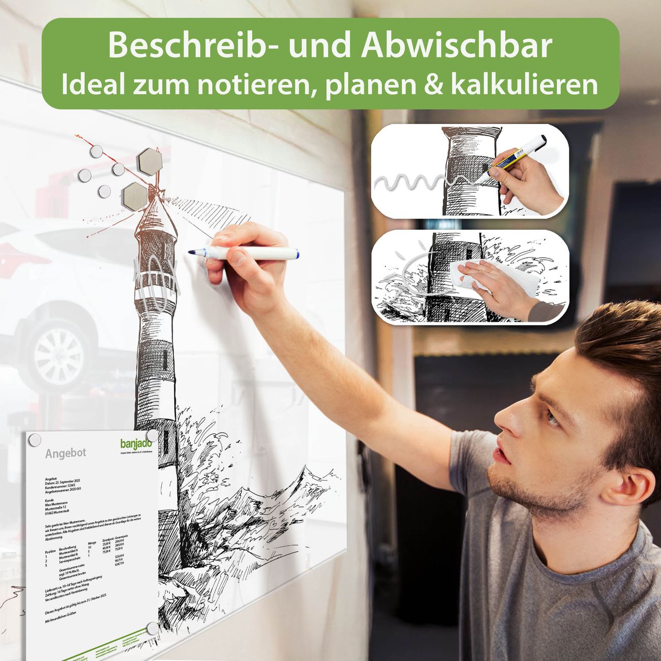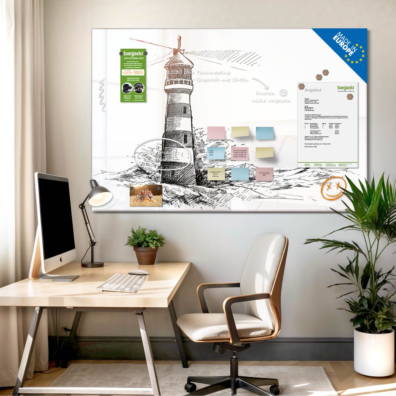 Jede Glas Magnettafel wird in unserer Werkstatt von Hand gefertigt und sorgfältig geprüft. So erhalten Sie ein echtes Qualitätsprodukt, das Funktion und Ästhetik perfekt vereint.?? Warum banjado?
