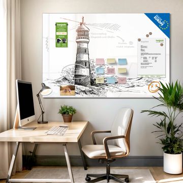Material: 4mm Sicherheitsglas mit Metallrückwand Eigenschaften: beschreibbar, magnetisch, kratzfest Maße: 120x80x0,6cm, 14,40kg schwer Motiv Nummer 13288 Leuchtturm in der Brandung Zubehör: inklusive 4 Neodym-Magnete