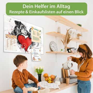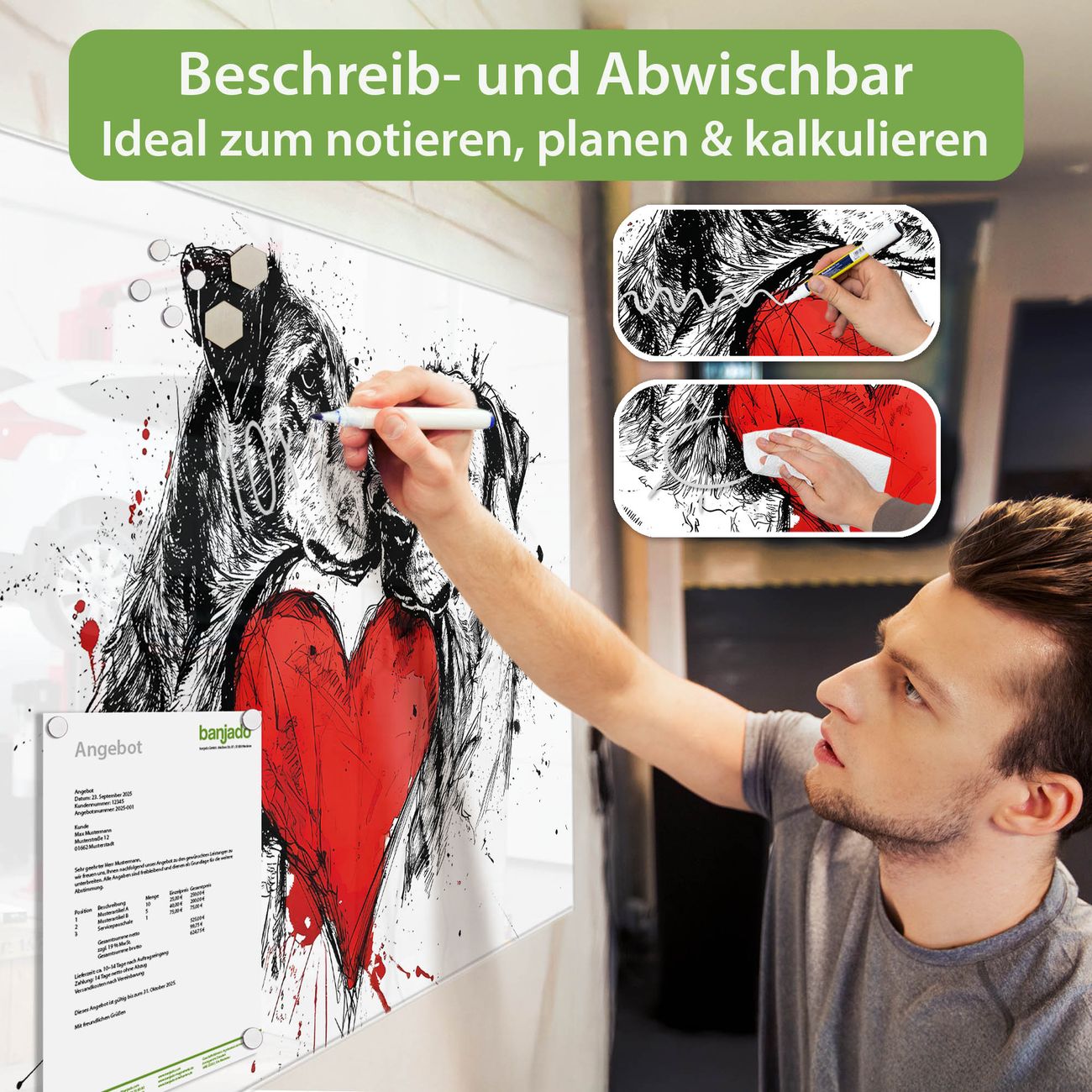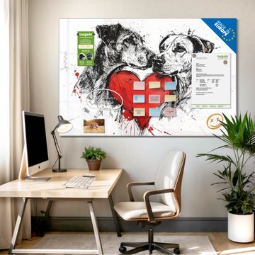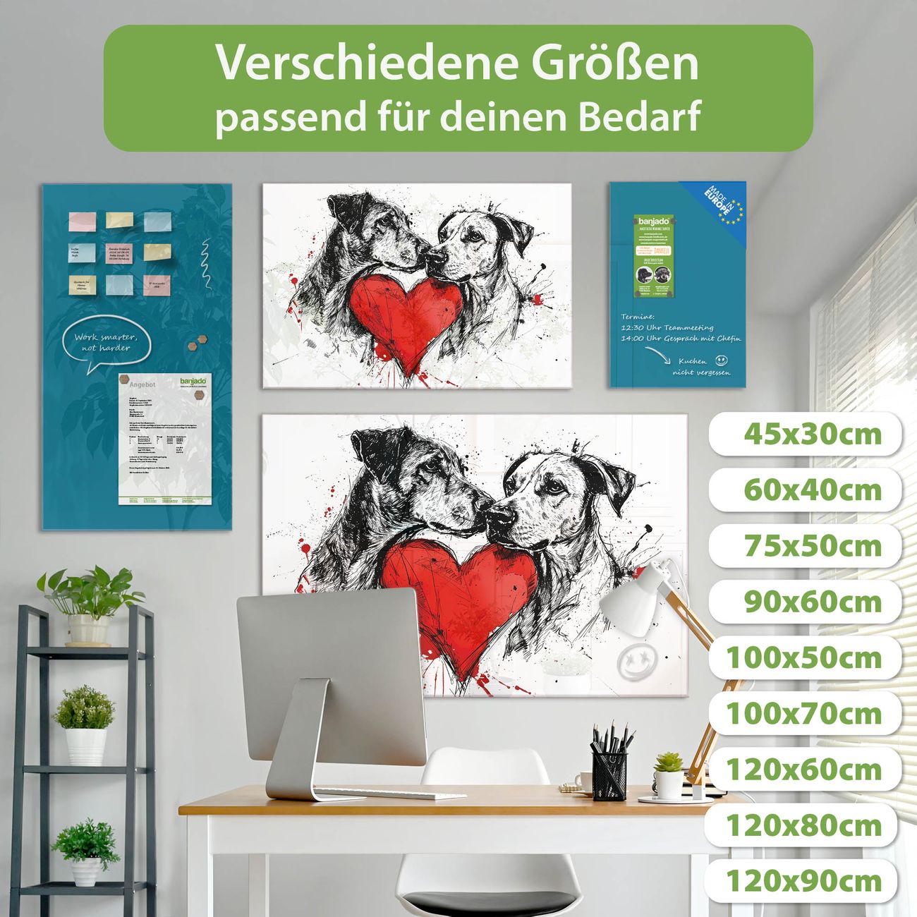 Material: 4mm Sicherheitsglas mit Metallrückwand Eigenschaften: beschreibbar, magnetisch, kratzfest Maße: 75x50x0,6cm, 5,63kg schwer Motiv Nummer 13422 Liebende Hunde 2 Zubehör: inklusive 4 Neodym-Magnete